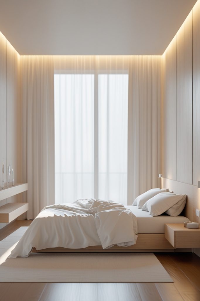 Texture is essential here, but it’s handled with restraint. Think linen drapes, soft-knit throws, and perhaps a simple woven rug underfoot. These elements add warmth and tactility without disrupting the minimalist aesthetic. The palette remains soft—off-white, pale gray, and warm wood tones create a space that feels both cozy and calming.