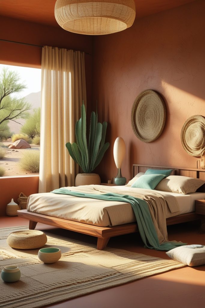 Bringing the warmth of nature indoors, this earthy bedroom uses a palette of terracotta, sand, jute, and walnut to create a comforting, grounded environment. Textured plaster walls in desert tones set a welcoming backdrop, while layered bedding and woven rugs contribute tactile richness.