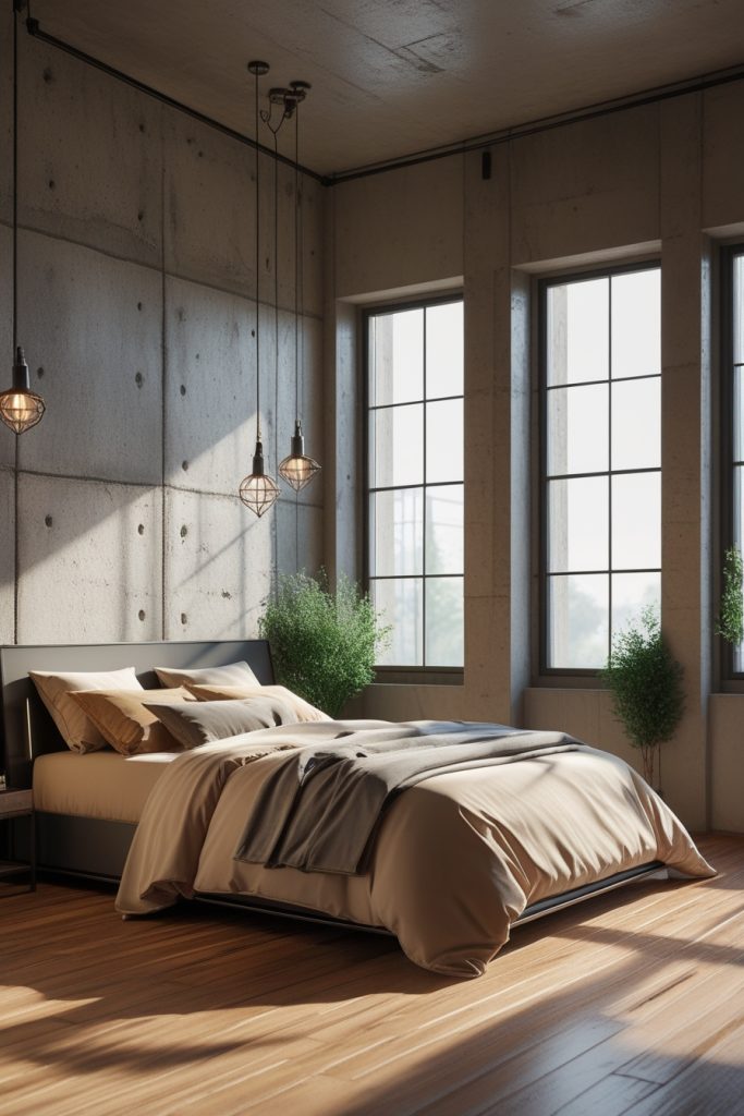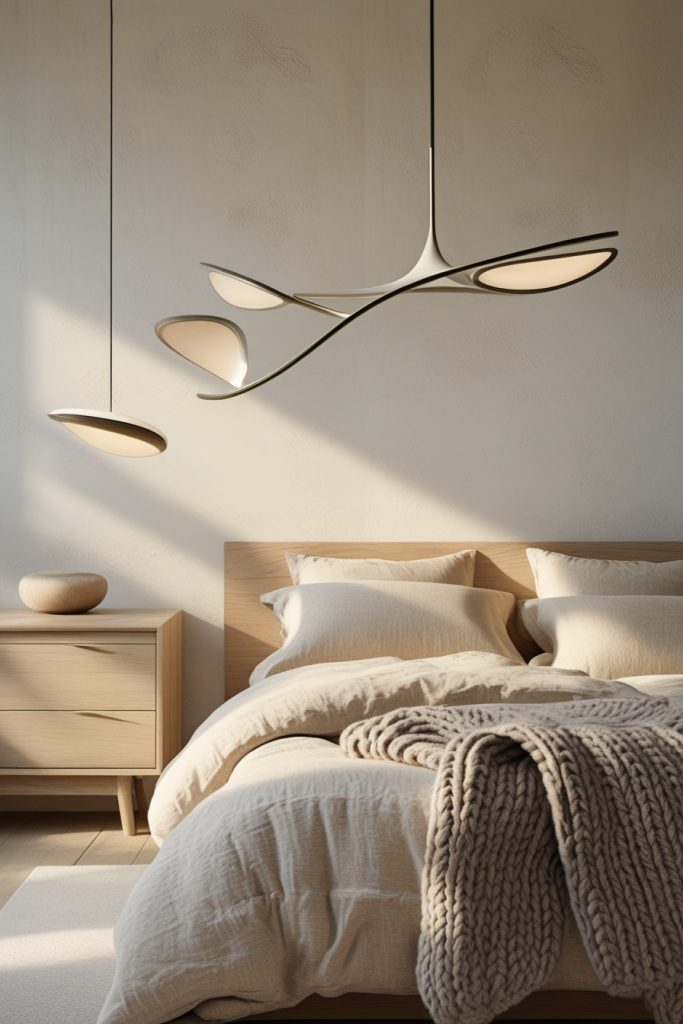 Metal lighting fixtures—like brushed steel or black iron—add a sculptural element, while oversized pillows and downy comforters ensure the room remains welcoming. Subtle touches, like a sheepskin rug or a linen throw, add just enough softness to offset the harder surfaces.