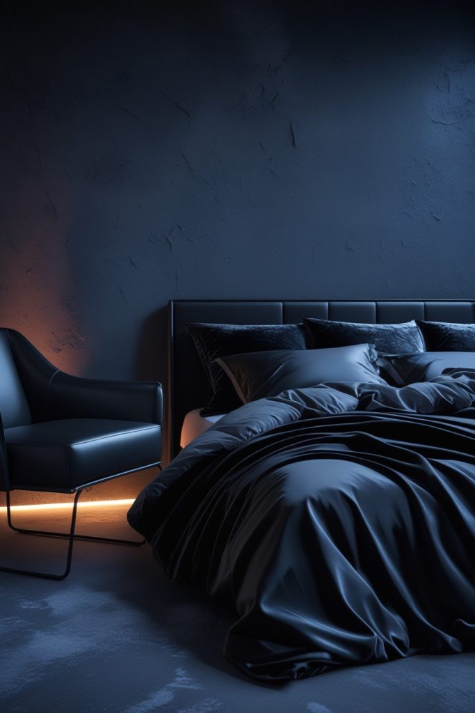 For those who gravitate toward bold, dramatic spaces, this moody bedroom embraces the darker side of modern design with elegance. Charcoal walls, black velvet bedding, and rich textures create a cocoon-like atmosphere perfect for deep rest. Ambient lighting is layered thoughtfully, casting soft shadows that enhance the room’s depth and intimacy.
