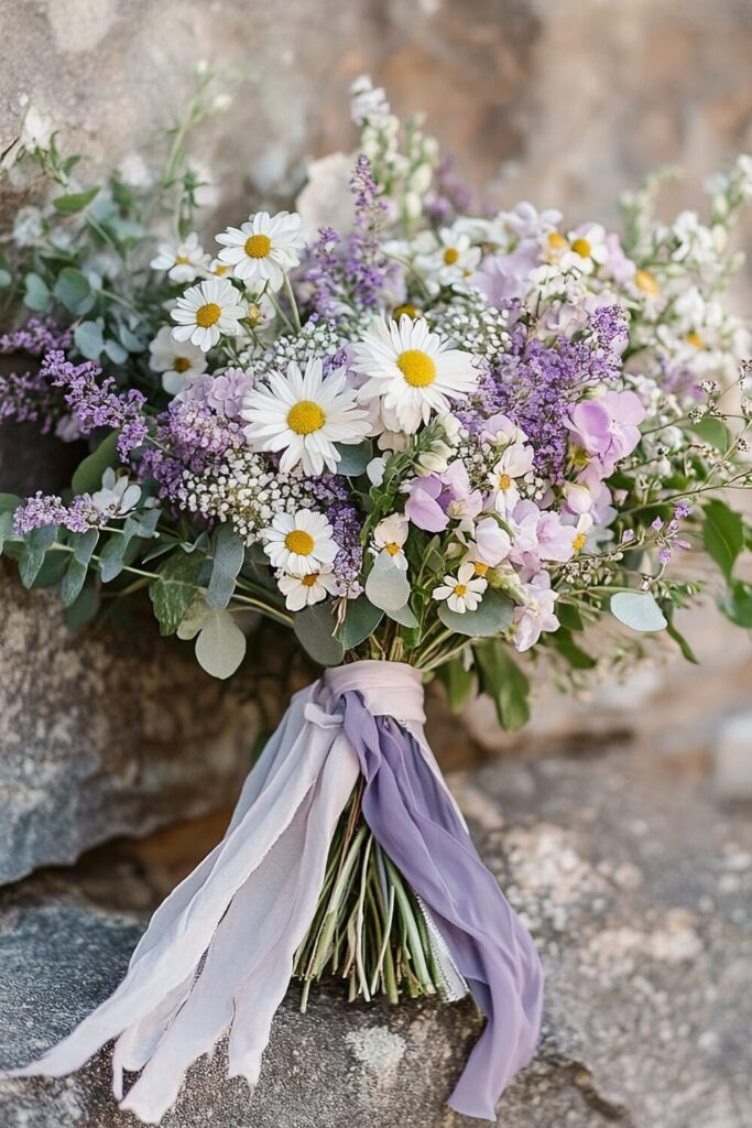 Mixing colorful daisies, lavender, chamomile, and tiny greenery creates a bouquet that feels playful and full of life. It’s perfect for moms who love natural beauty and relaxed cottage-style flowers.