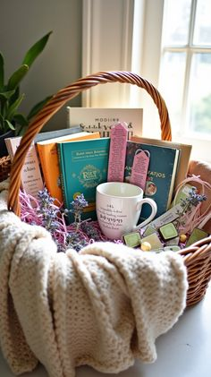 For moms who love reading, this basket idea feels so comforting and personal. Add a good book, bookmarks, tea, cozy socks, snacks, and a soft blanket.