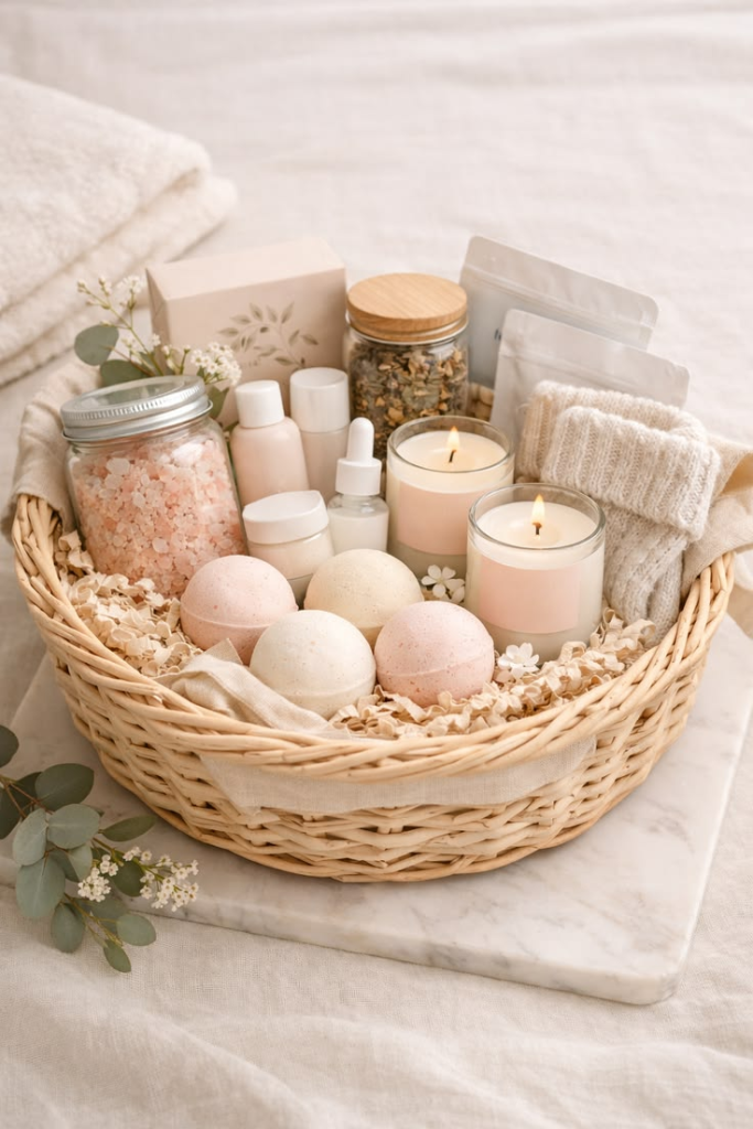 The prettiest spa baskets always feel calm and cozy with soft colors, ribbons, and little thoughtful details tucked inside.