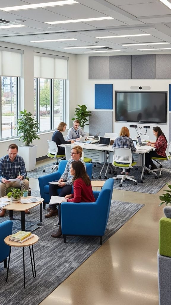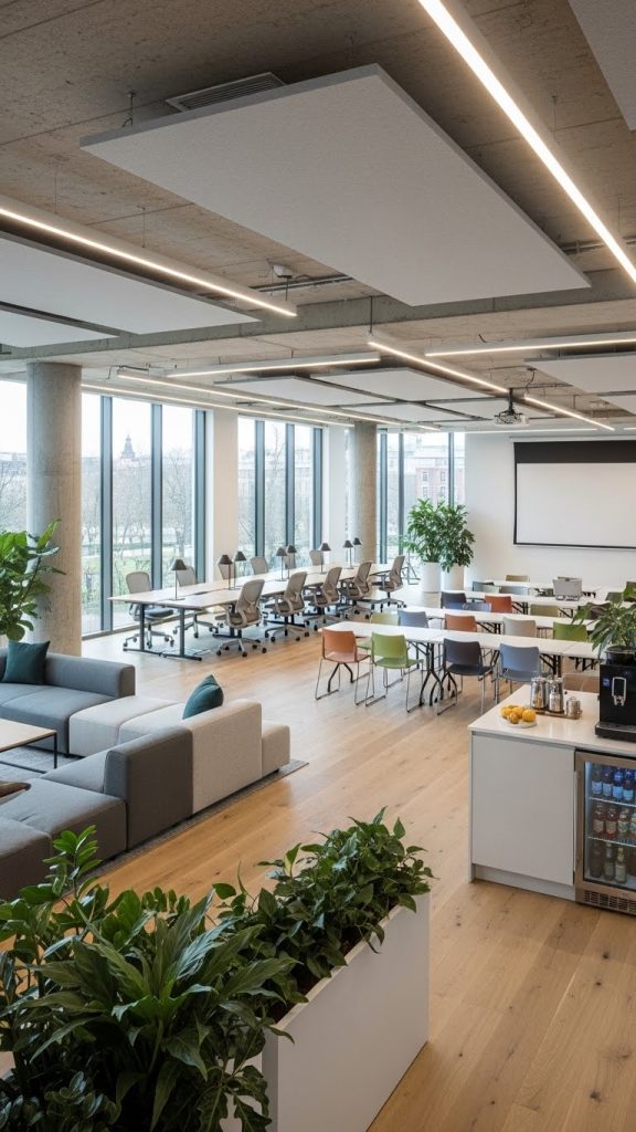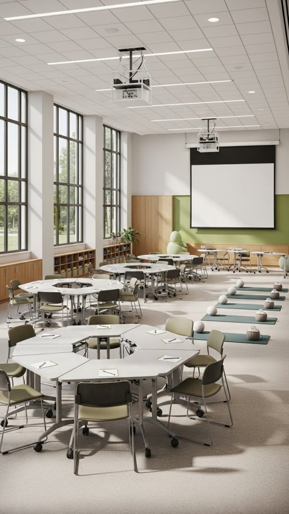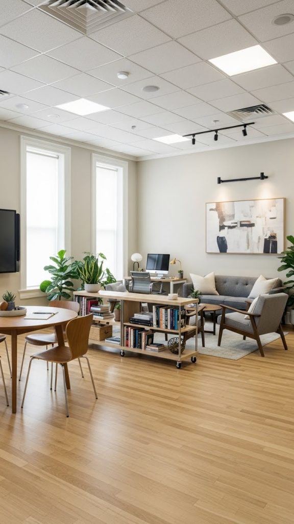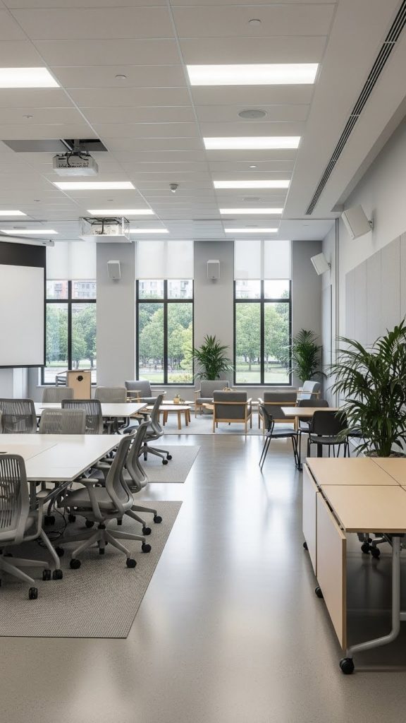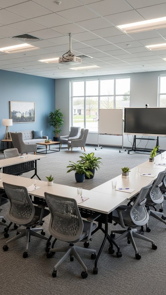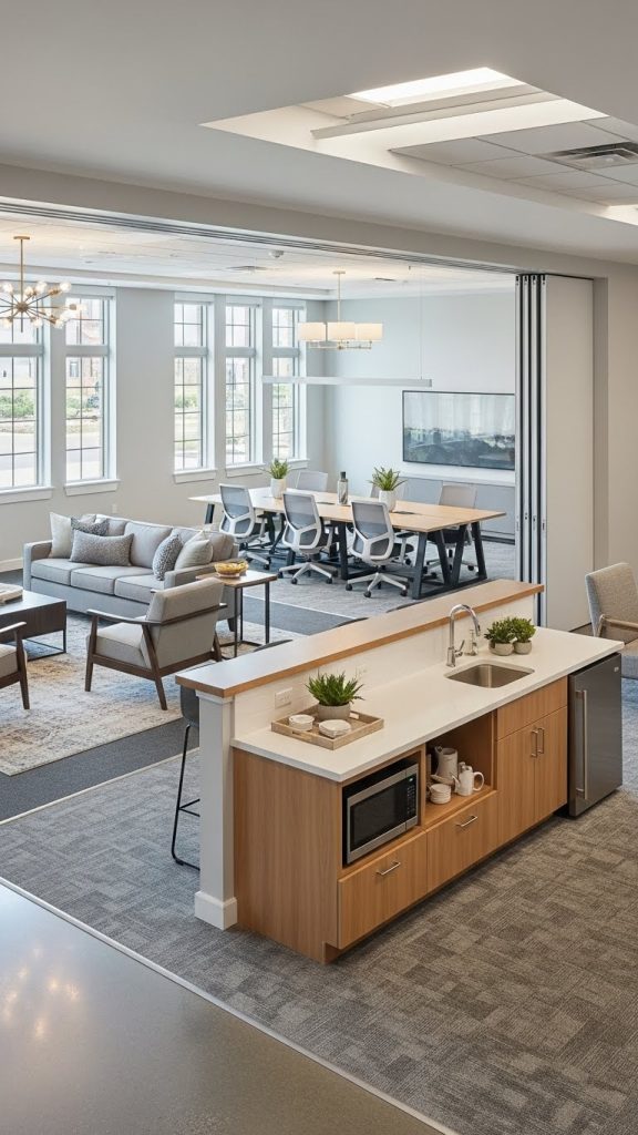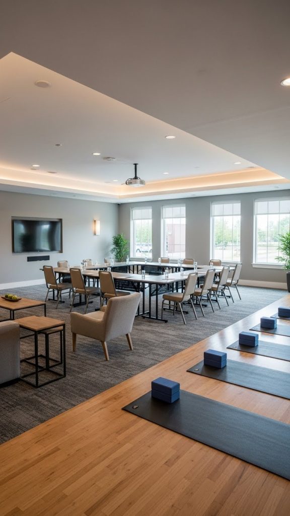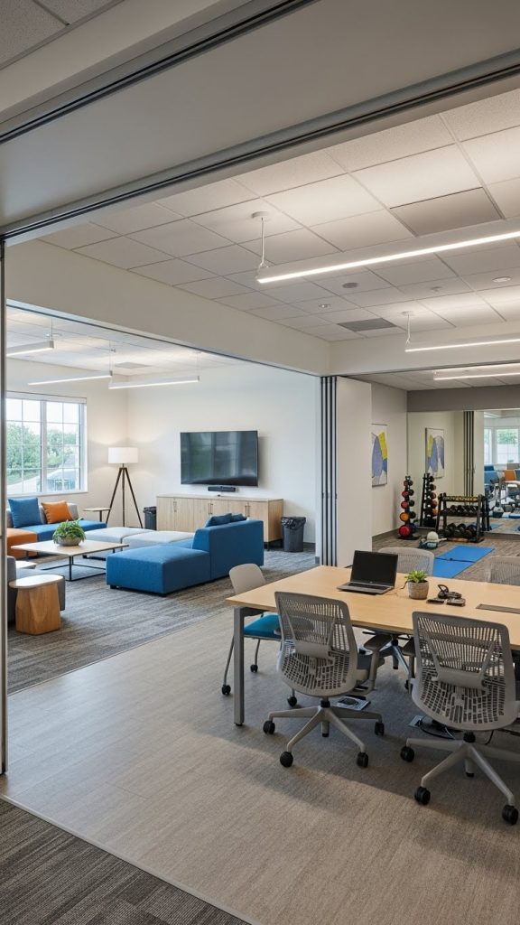 Creating a relaxation zone in a multipurpose room can be a delightful project. The image shows a spacious area with soft lighting and comfortable seating, perfect for unwinding. The design encourages a calm atmosphere, making it an ideal spot for breaks or casual meetings.