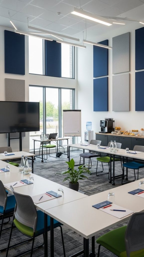 Natural elements, such as the plants, add a touch of warmth to the otherwise professional environment. This balance between technology and comfort makes it an inviting place for both work and relaxation. With smart technology, you can easily adapt the room for any occasion, whether it’s a formal meeting or a casual team-building event.