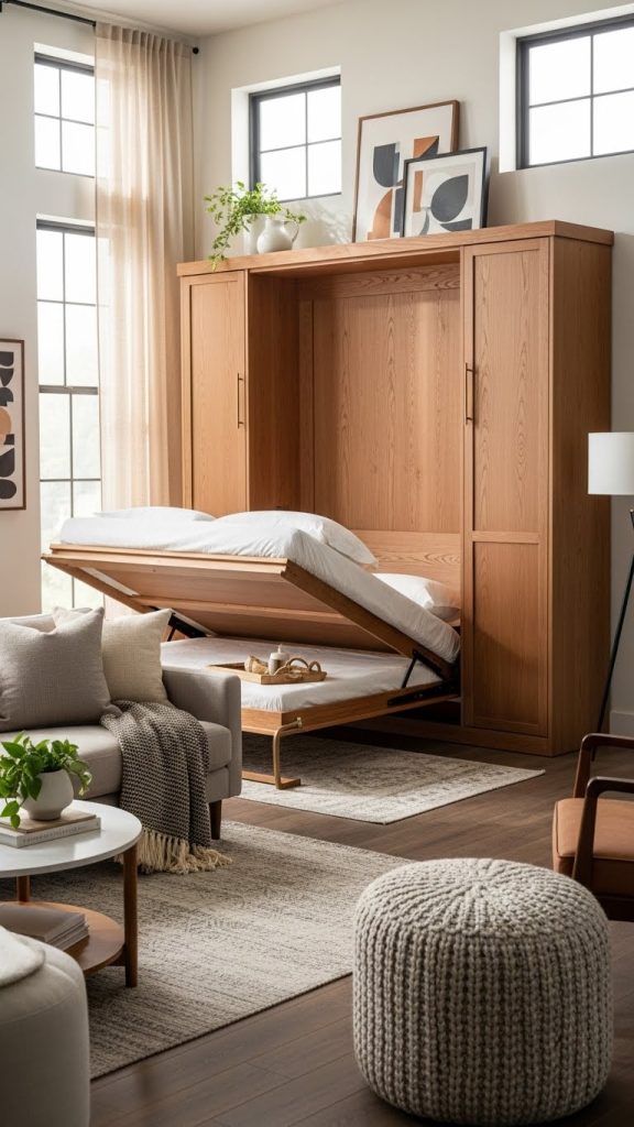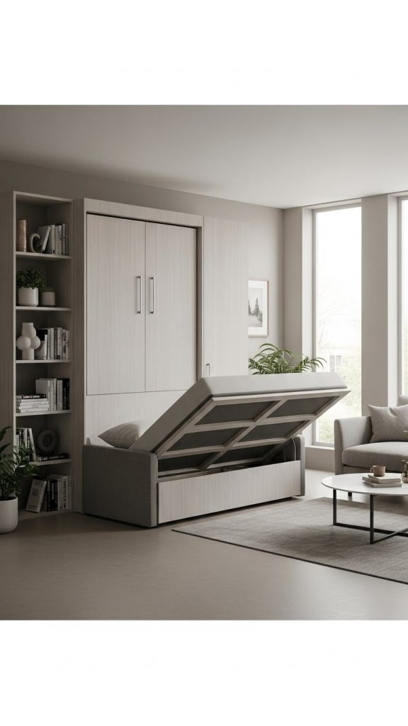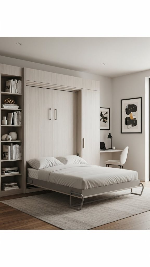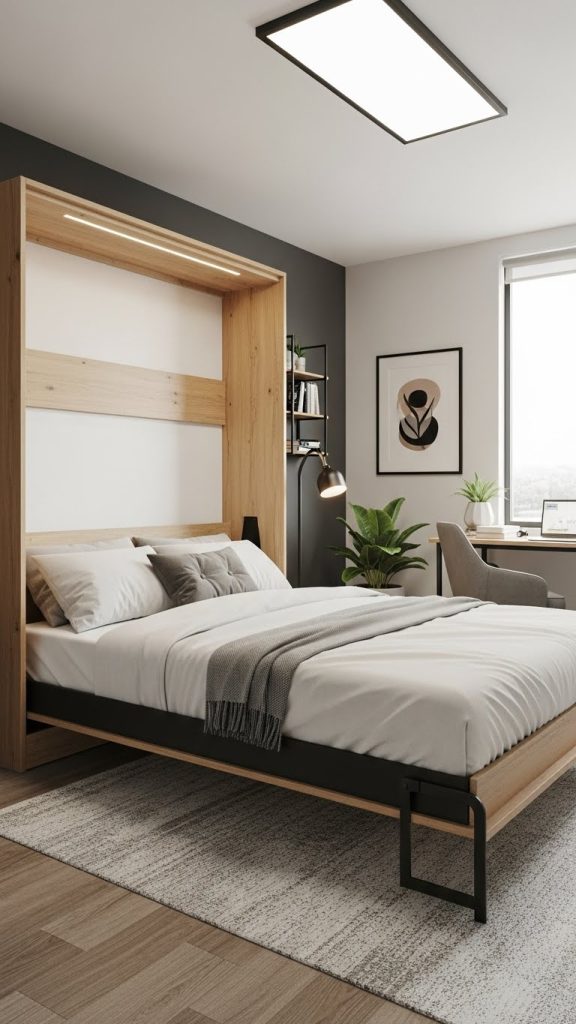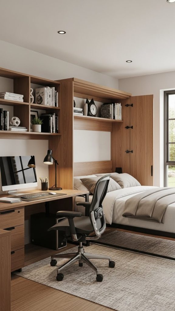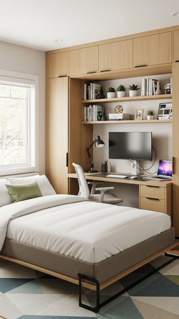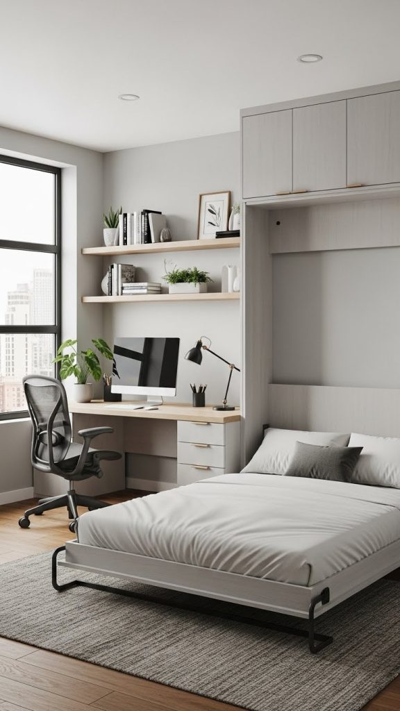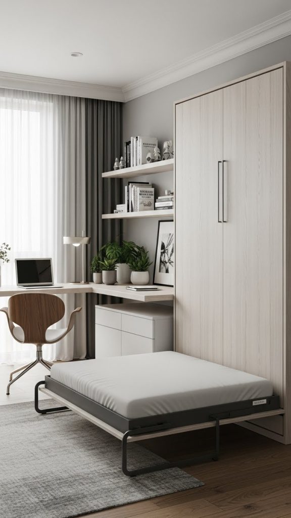 Murphy beds are a fantastic solution for small spaces, turning a simple room into a multi-functional area. The image shows a cozy setup where a Murphy bed seamlessly integrates with an office space.