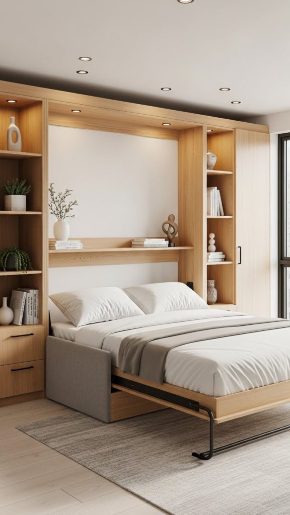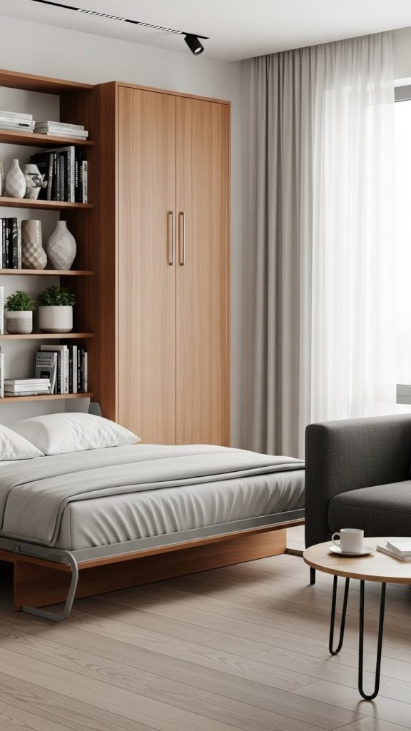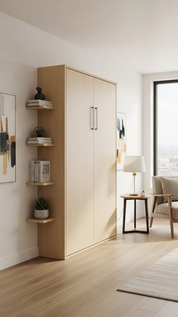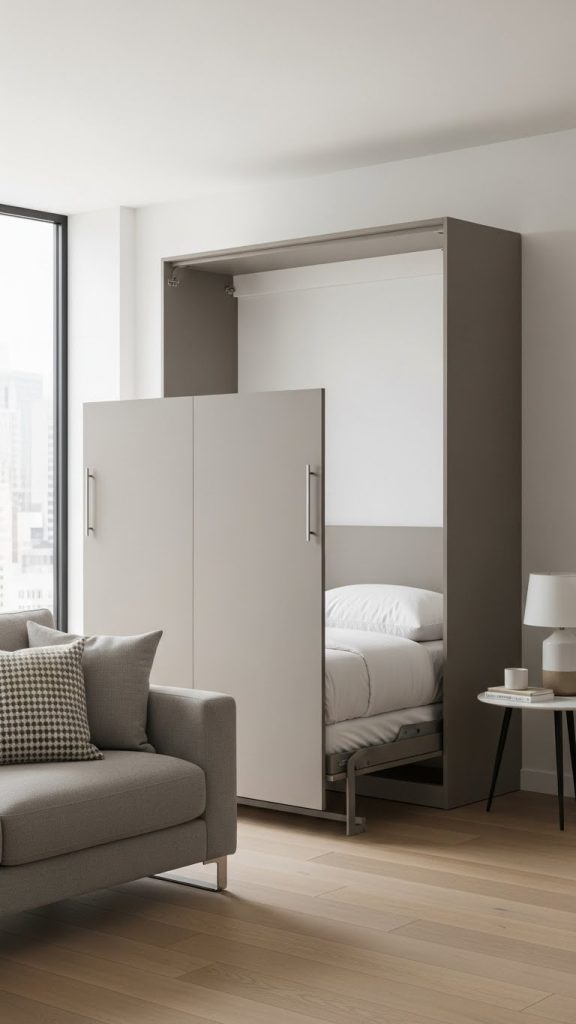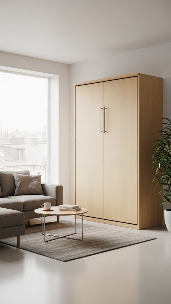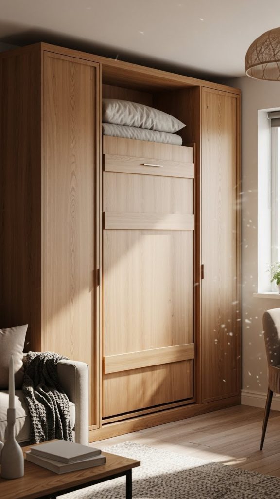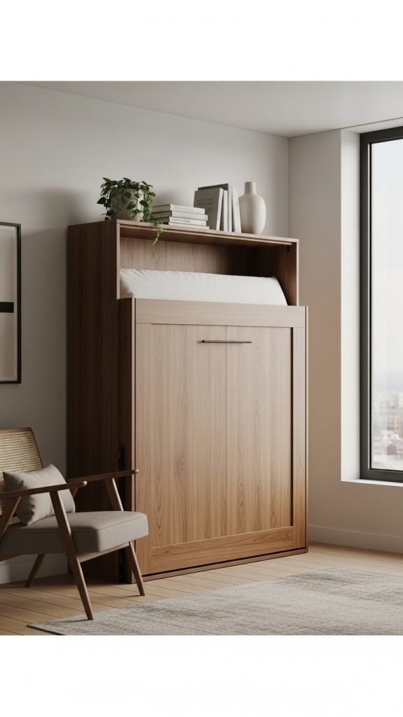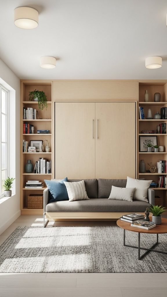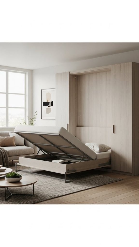 Murphy beds are a fantastic solution for small spaces, turning a simple room into a multi-functional area. The image shows a cozy setup where a Murphy bed seamlessly integrates with an office space.