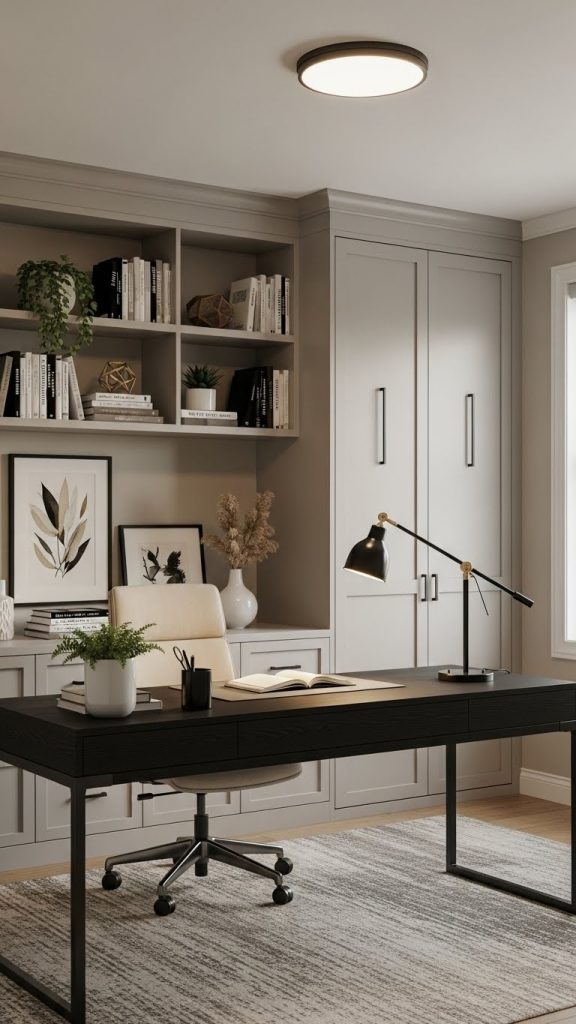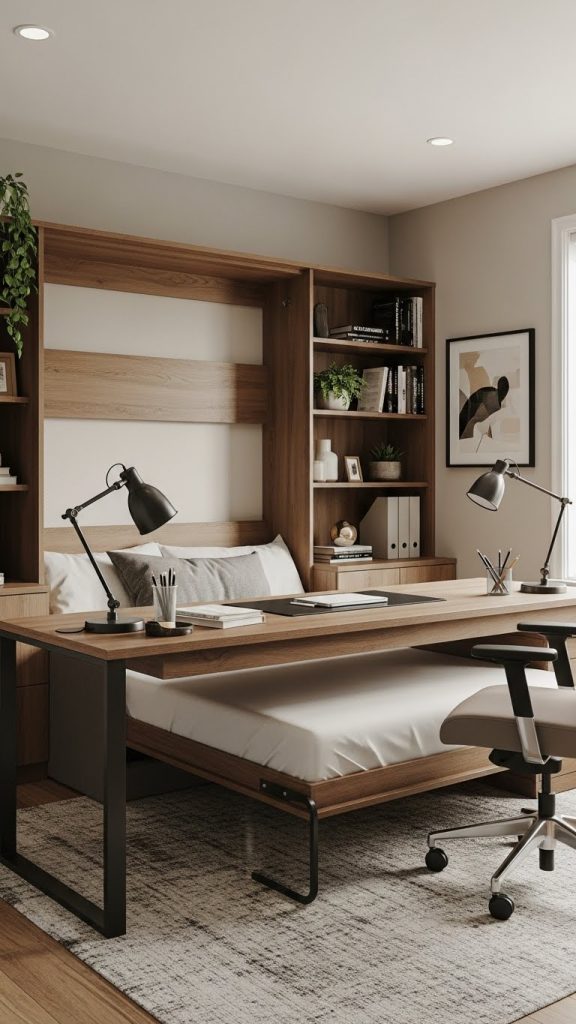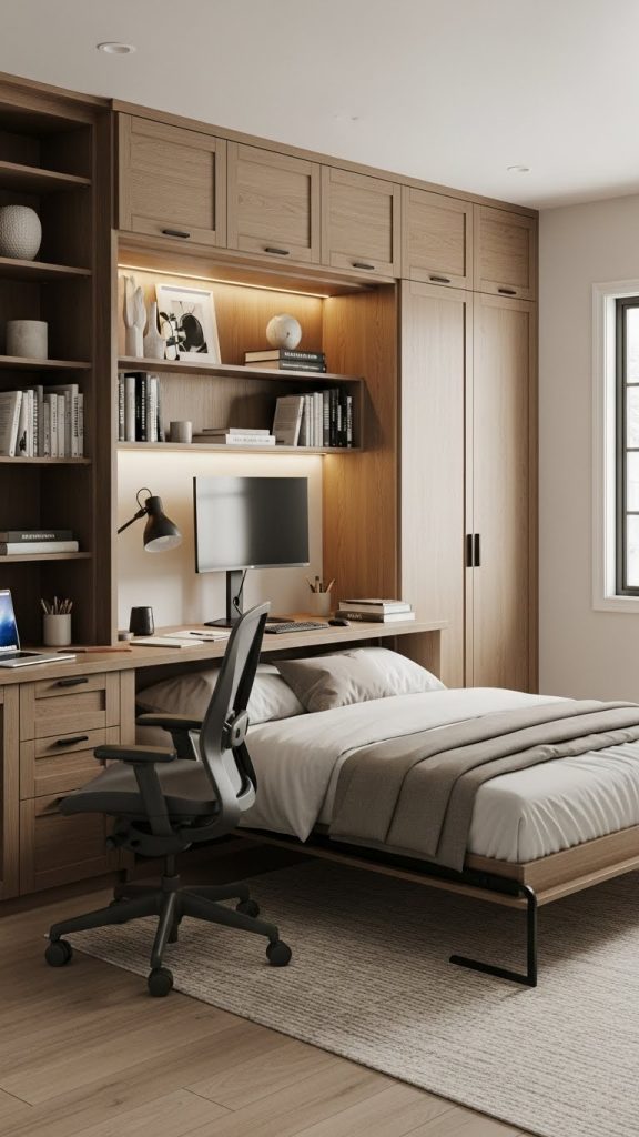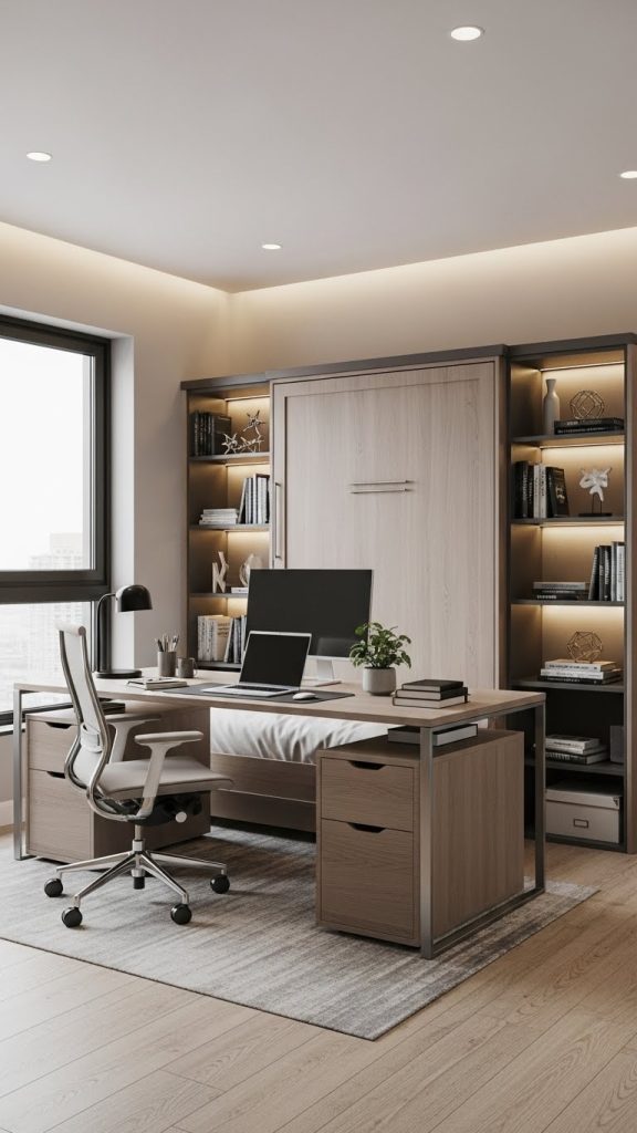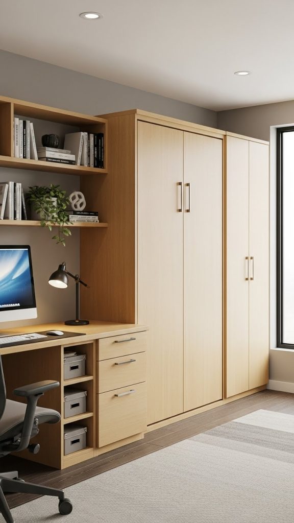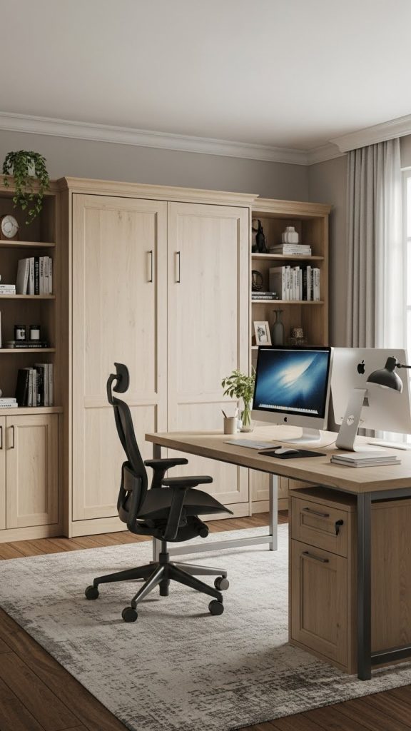 Incorporating storage solutions, like shelves and drawers, helps keep everything tidy. This design not only looks good but also serves a practical purpose. A Murphy bed office can be a stylish and efficient way to utilize your space.