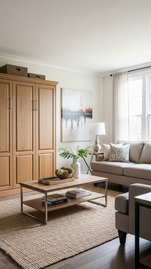 When the bed is tucked away, the room feels open and spacious, ideal for daytime activities.