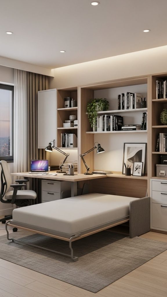 In this setup, the Murphy bed is cleverly integrated into the design, allowing for easy transformation from an office to a cozy sleeping area.