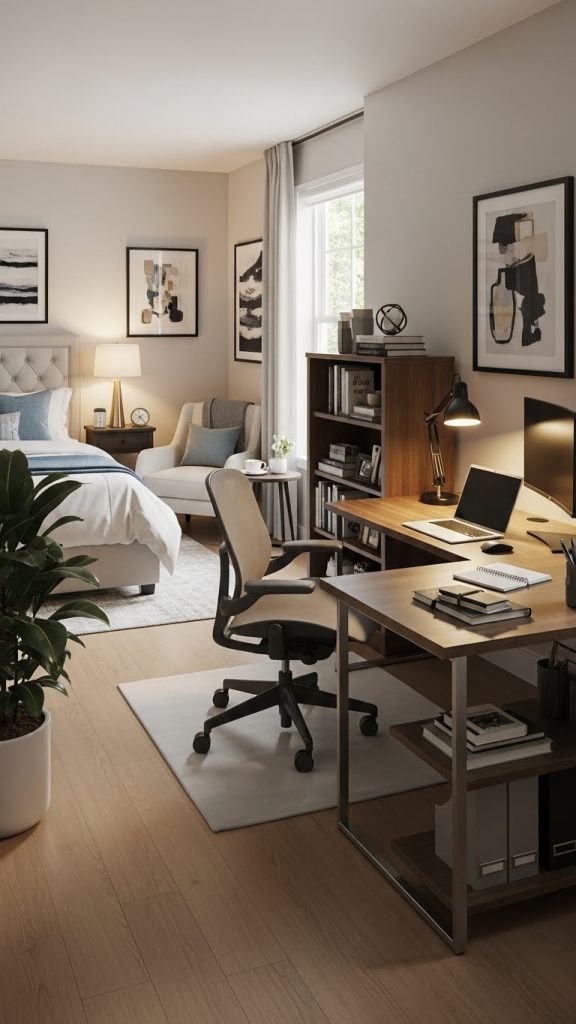 Choosing furniture that fits well together is key. The desk is compact yet functional, allowing for productivity without taking up too much space. The bed is neatly made, showing that it can easily transform into a restful retreat.