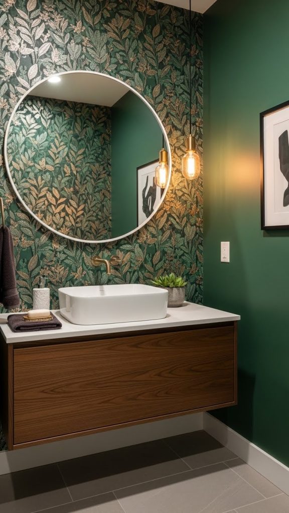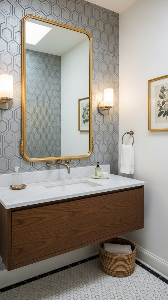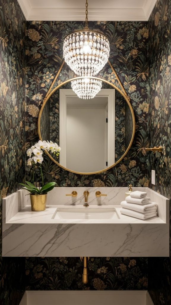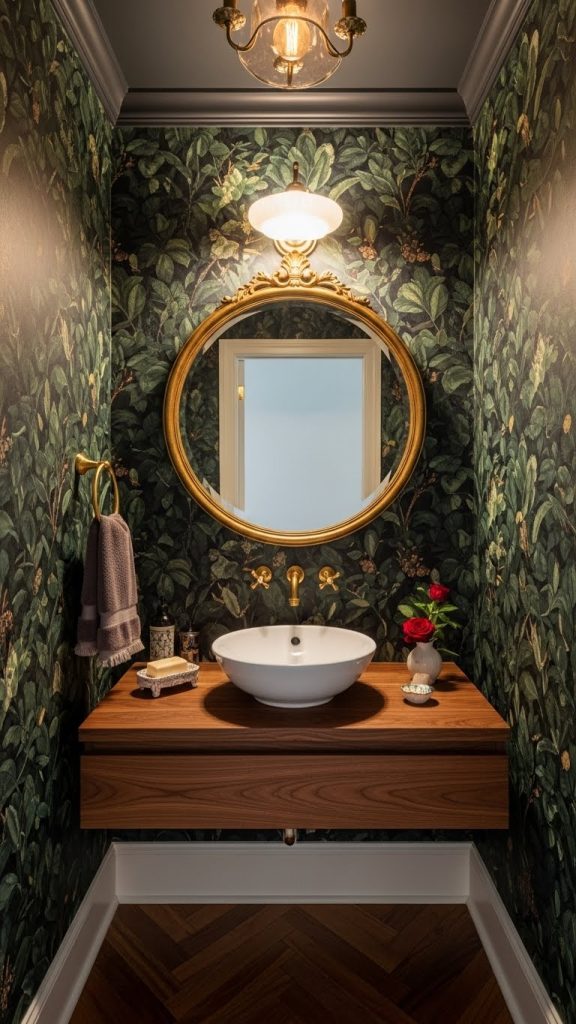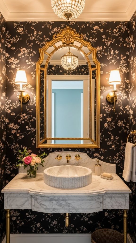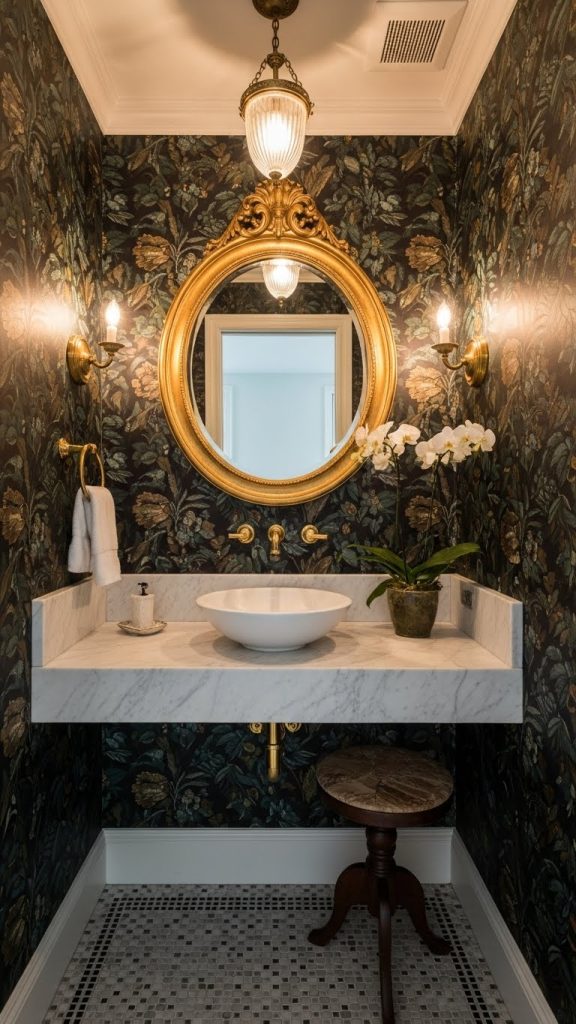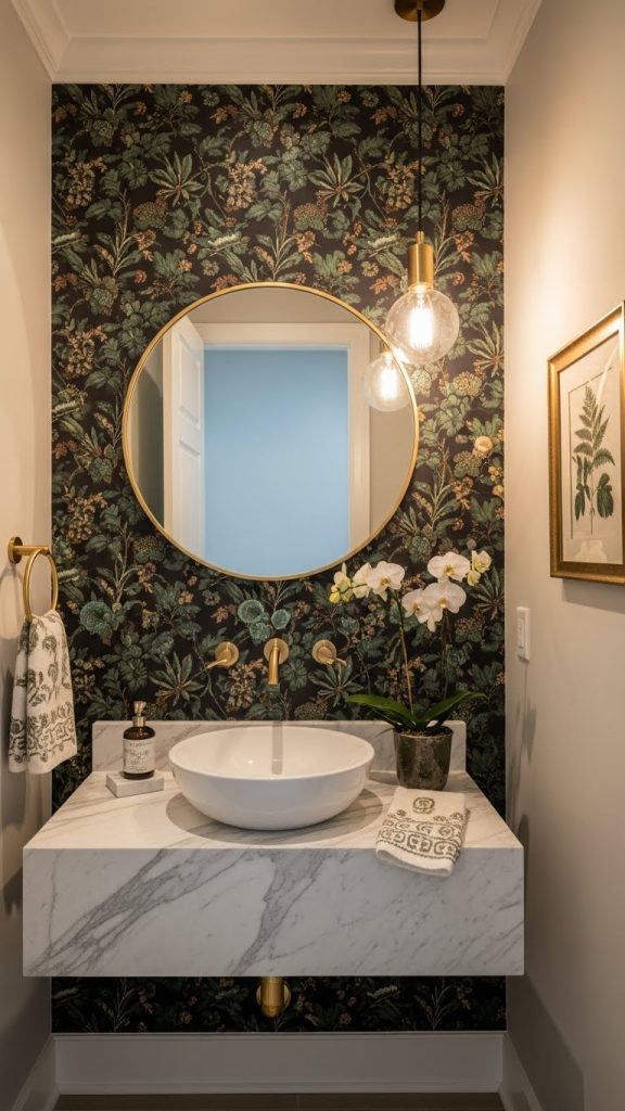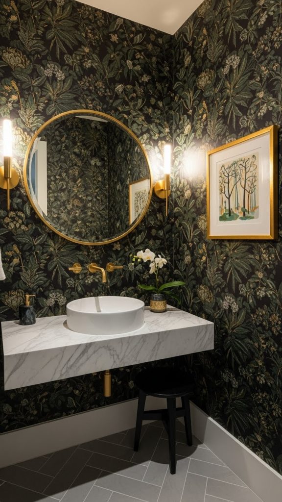 Pairing bold wallpaper with simple fixtures, like the white sink and toilet shown here, helps to balance the look. The gold accents add a touch of elegance, making the space feel more refined. A few decorative touches, such as fresh flowers, can enhance the overall vibe.