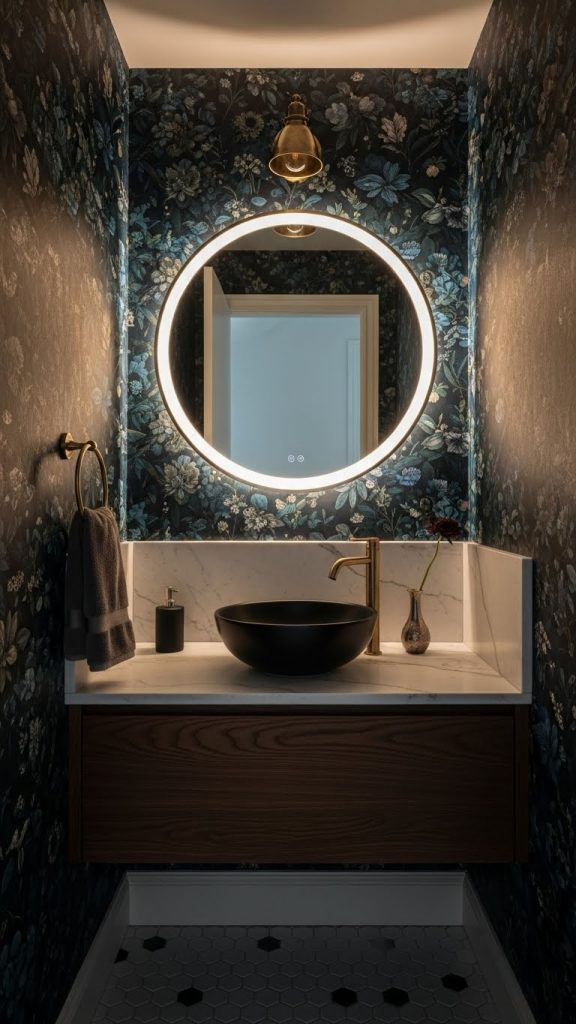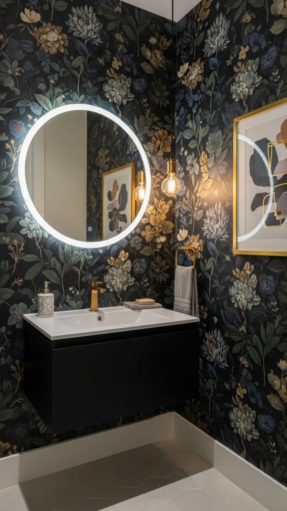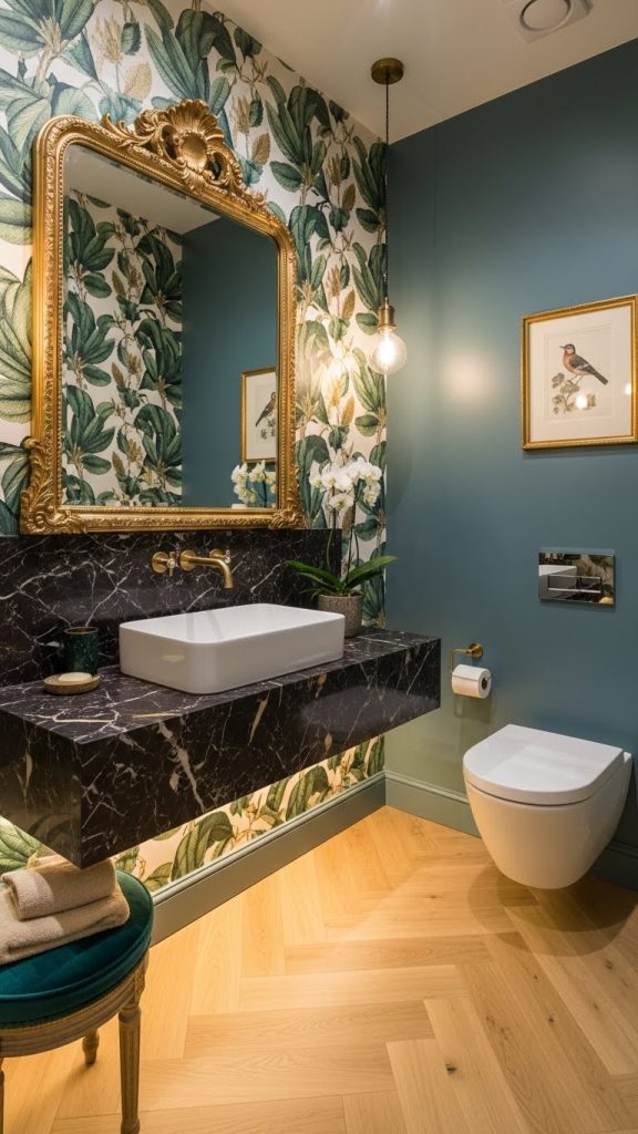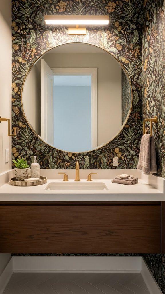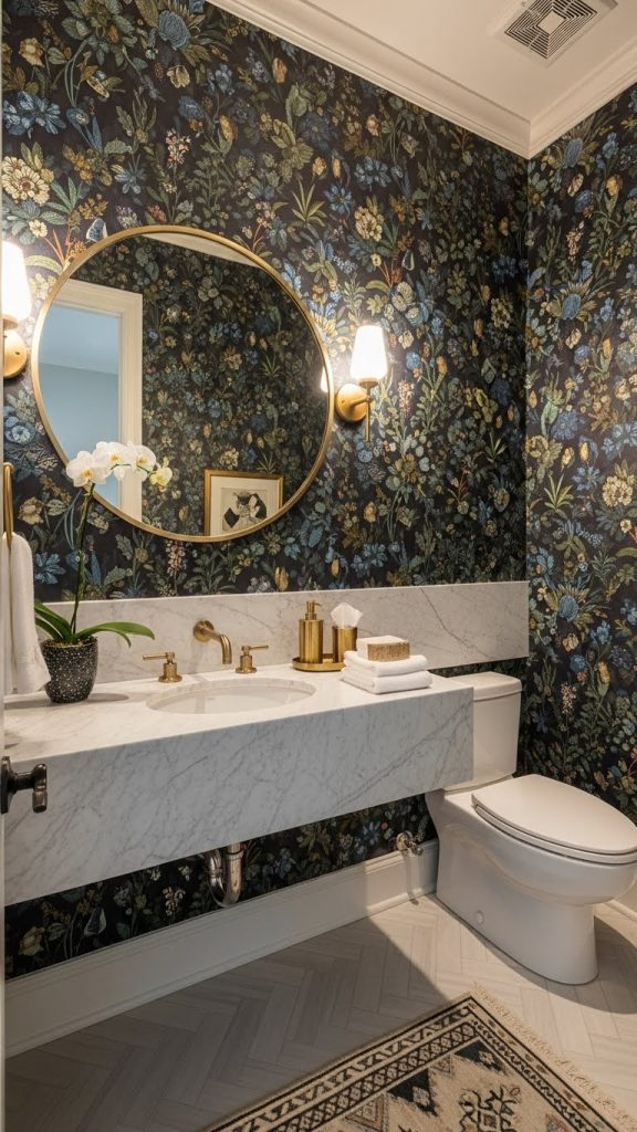 Choosing bold wallpaper can completely change the feel of a powder room. The vibrant floral pattern in this image is a perfect example. It brings life and energy to a small space, making it feel welcoming and unique.