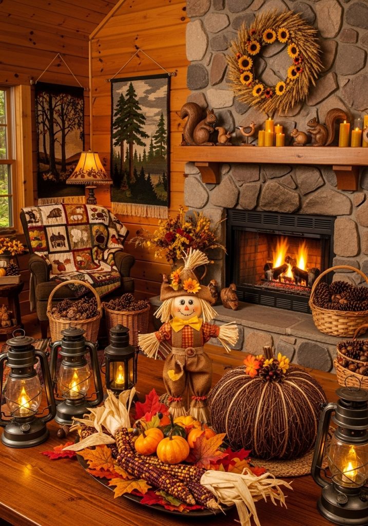 To complete the look, incorporate faux fur throws, vintage flannel blankets, or plaid textiles. Use oil lanterns or battery-operated rustic lanterns for lighting, casting a soft glow that enhances the mood. It’s all about creating a space that feels natural, peaceful, and in tune with the season’s rhythms.