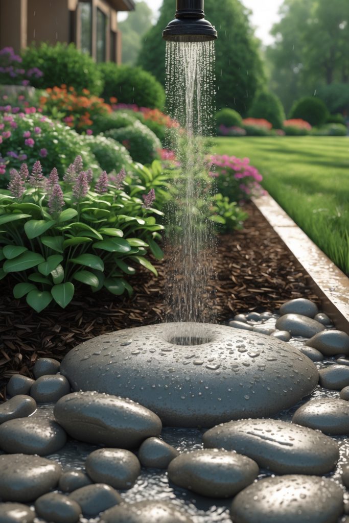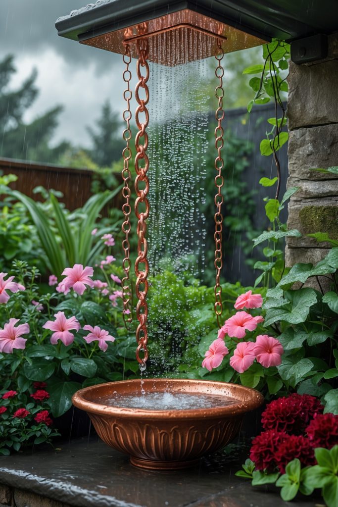 A rain chain offers a stylish alternative to traditional downspouts. These decorative chains guide rainwater from your roof gutter to the ground or into a rain barrel in a slow, controlled flow. As the water travels down the chain—often made of linked cups or rings—it creates a soothing, waterfall-like sound. Rain chains come in a variety of materials like copper, aluminum, or steel and serve as functional art in your garden. Pair one with a rock basin or ceramic bowl at the base to catch and slow the water while enhancing the visual appeal.