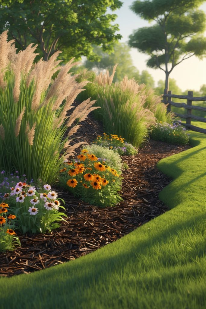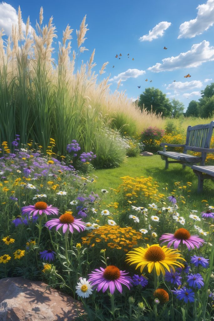 Replace traditional grass with a native wildflower or meadow garden to absorb water, support pollinators, and reduce mowing.