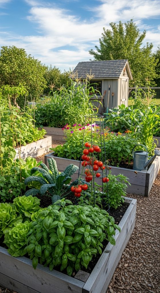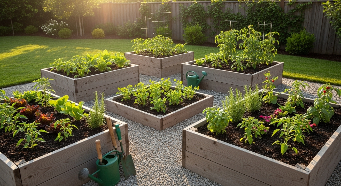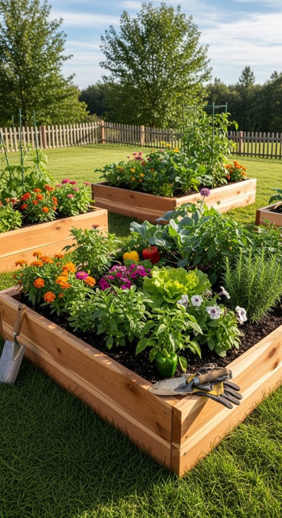 Raised garden beds are a fantastic way to grow your plants while keeping them safe from pests. The image shows a vibrant garden with various plants thriving in their wooden beds. You can see a mix of flowers and leafy greens, all enjoying the sunshine.