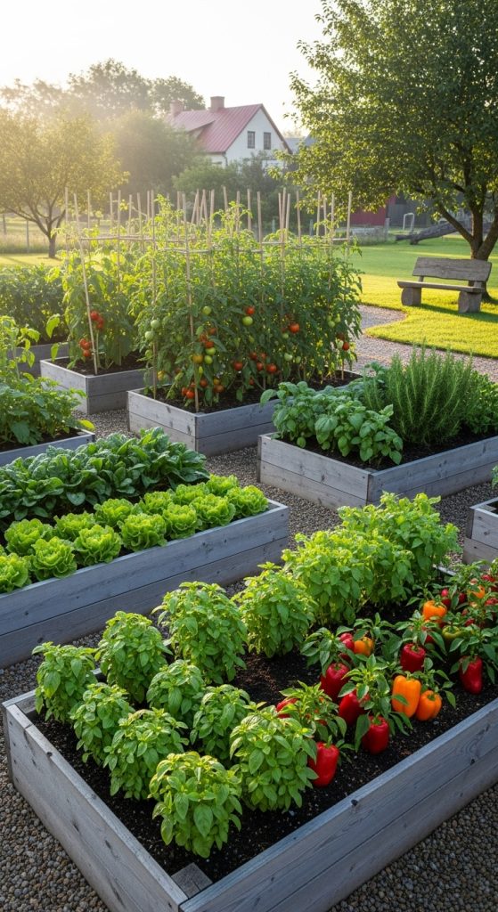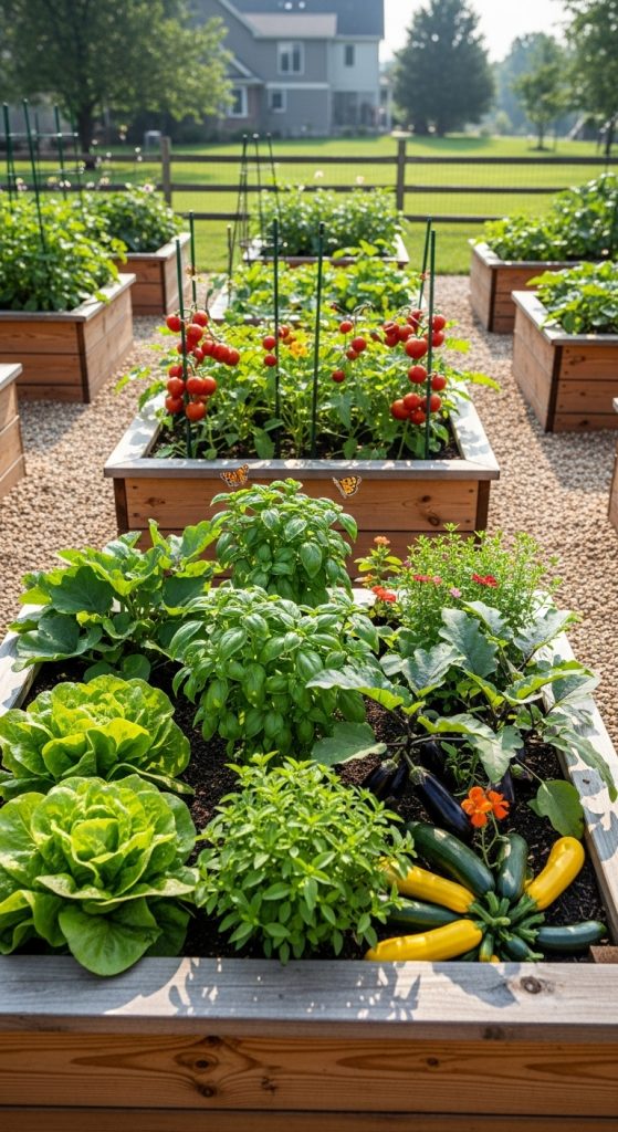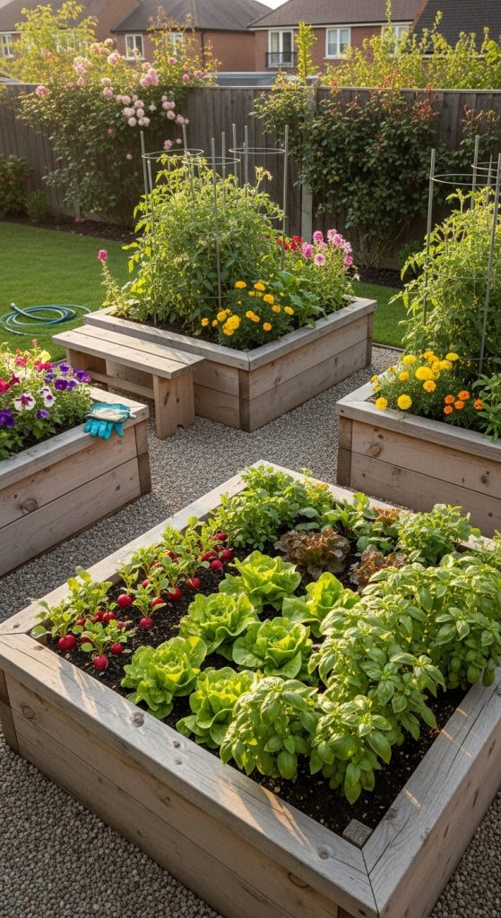 Don’t forget about pathways! The gravel paths in the image provide easy access to each bed without stepping on the soil. This keeps your garden tidy and prevents soil compaction. Think about how you will move around your garden when planning your layout.