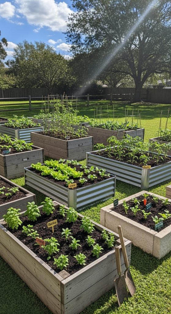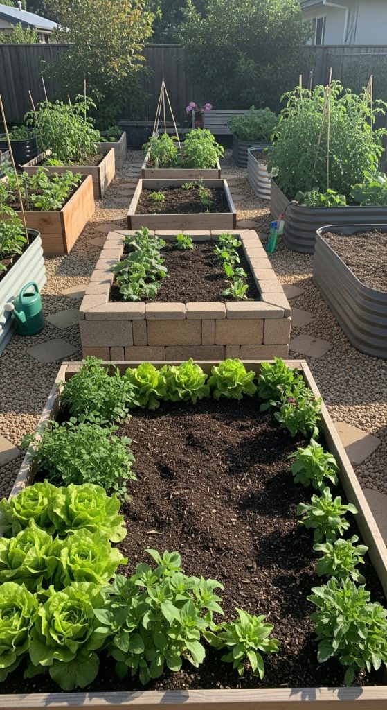 When setting up raised garden beds, the materials you choose can make a big difference. The image shows a variety of raised beds made from different materials, each with its own charm. You can see wooden beds, which are popular for their natural look, and metal ones that offer a modern touch.