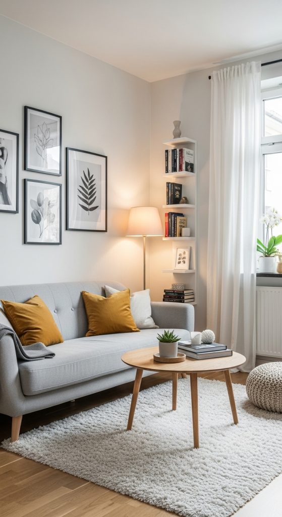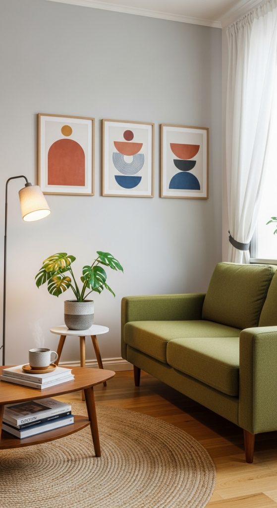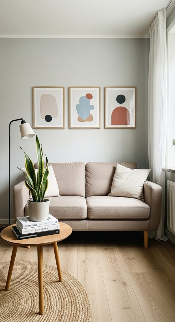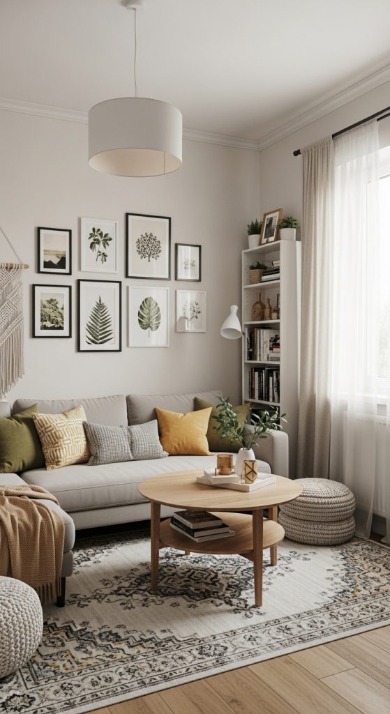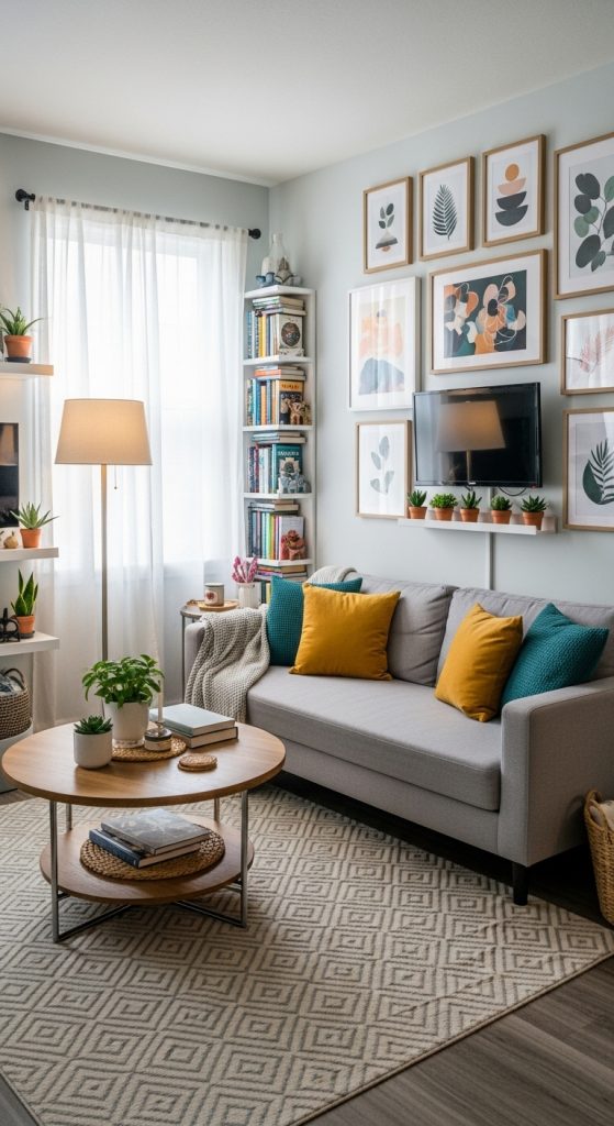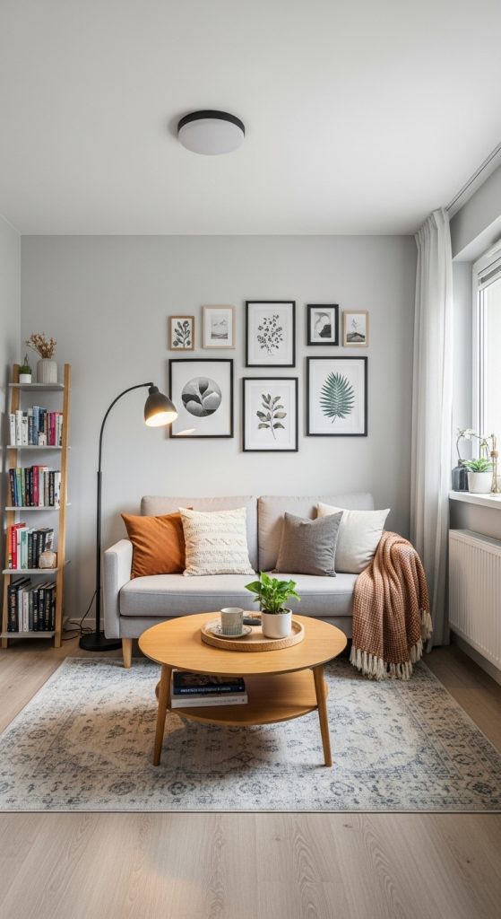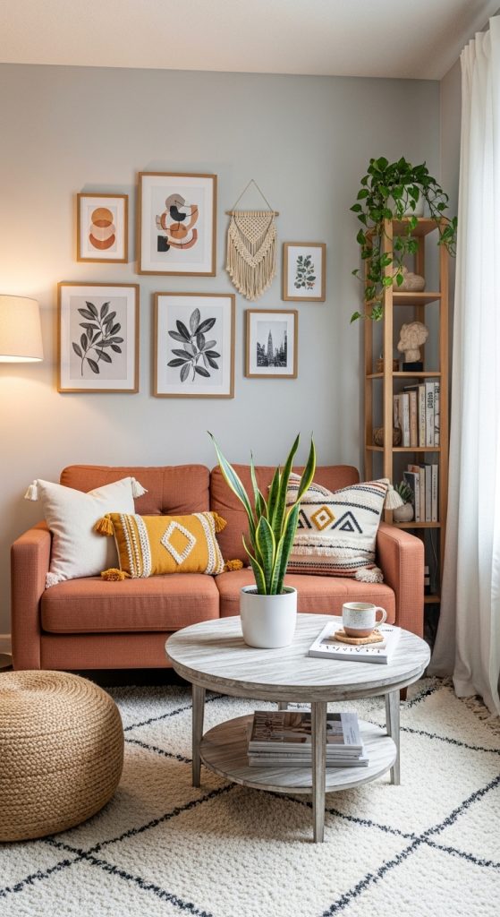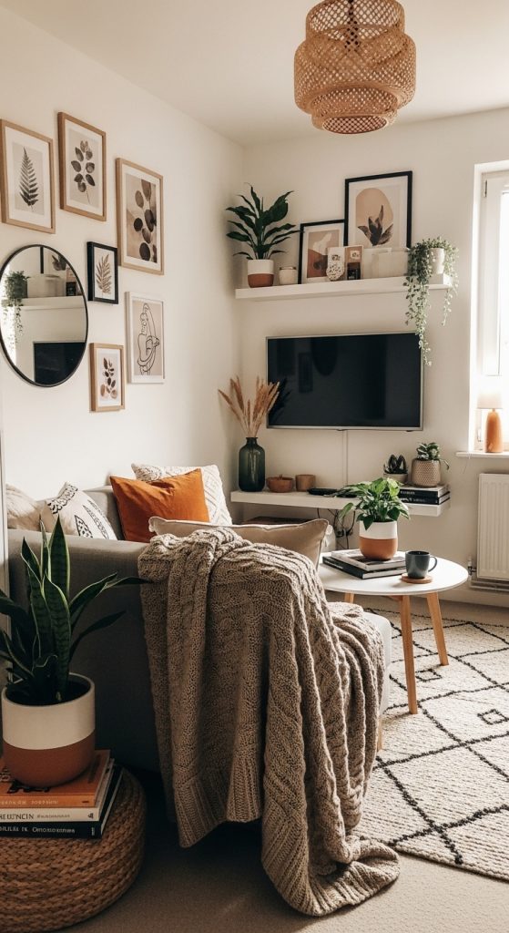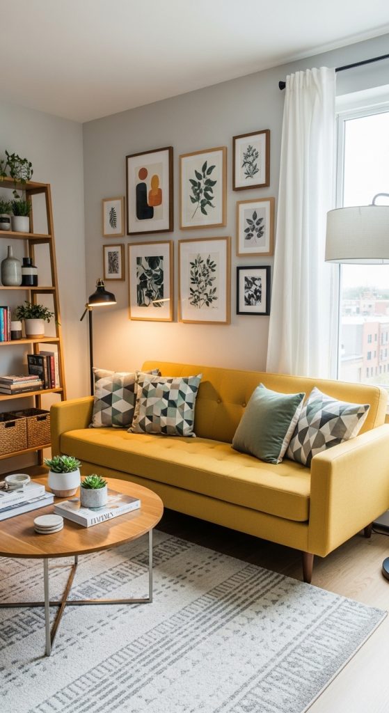 Wall art can truly transform a small apartment into a cozy and inviting space. In the image, we see a beautifully arranged gallery wall that showcases a mix of personal touches and artistic flair. Each piece tells a story, reflecting the personality of the homeowner.
