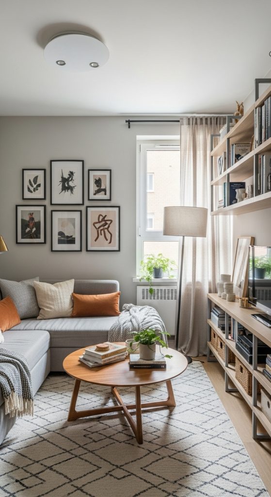 The round wooden table in front of the sofa adds a touch of warmth. It’s not just stylish; it serves as a place for drinks, snacks, or even a small workspace. This kind of multifunctional furniture is key in small spaces, allowing you to maximize every inch.