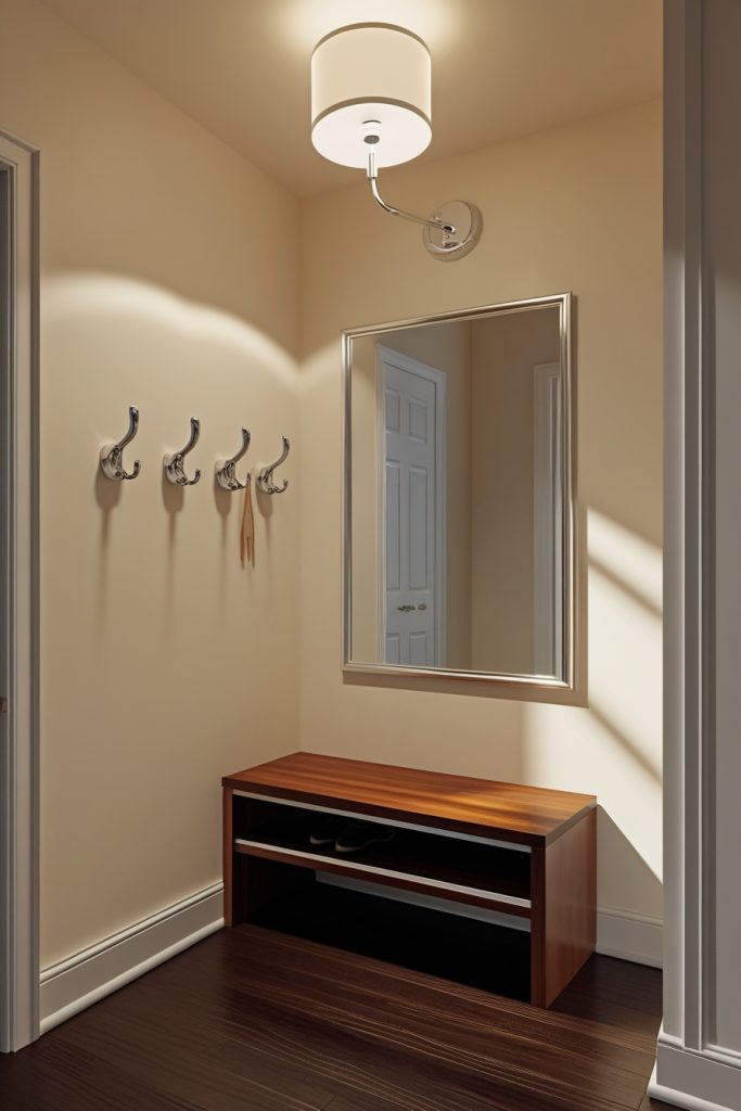 Even if your apartment lacks a designated foyer, you can still create a functional and stylish entryway. Place a slim bench with storage baskets underneath near the door, add a mirror above to reflect light and check your outfit, and install wall hooks for coats, bags, or hats. This setup offers a welcoming touch while keeping daily essentials organized and within easy reach.