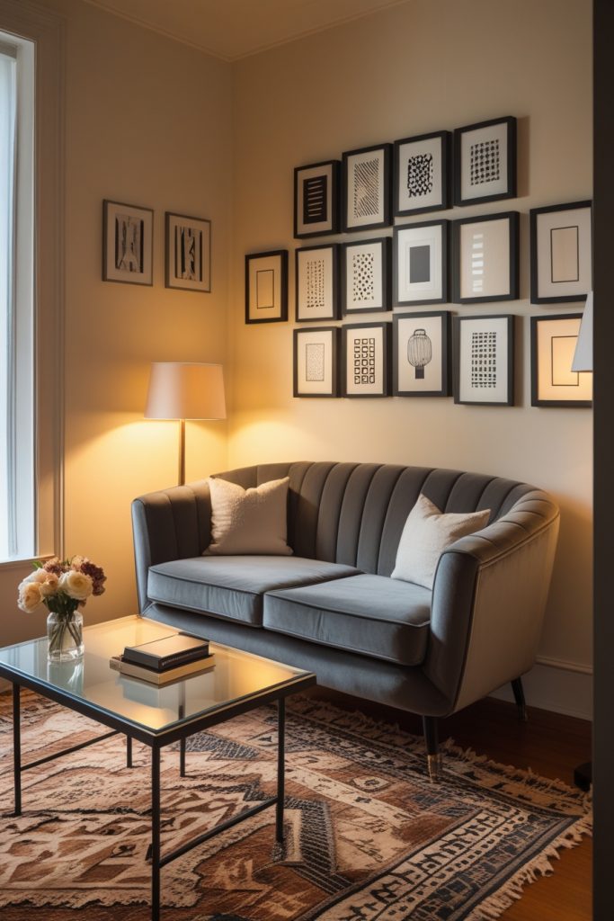 In a small apartment, a gallery wall becomes a focal point, adding depth and visual interest without cluttering shelves or surfaces. Stick to a cohesive color palette or frame style to keep the look polished.