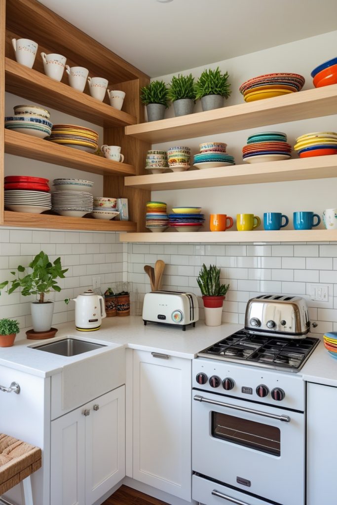 Ditch bulky upper cabinets in favor of open shelving to create a lighter, more open feel in the kitchen. This approach encourages neatness and allows you to turn everyday dishes, jars, or cookbooks into styled displays. Combine functional items with touches of decor—like a small framed print or plant—to keep things practical and visually appealing.