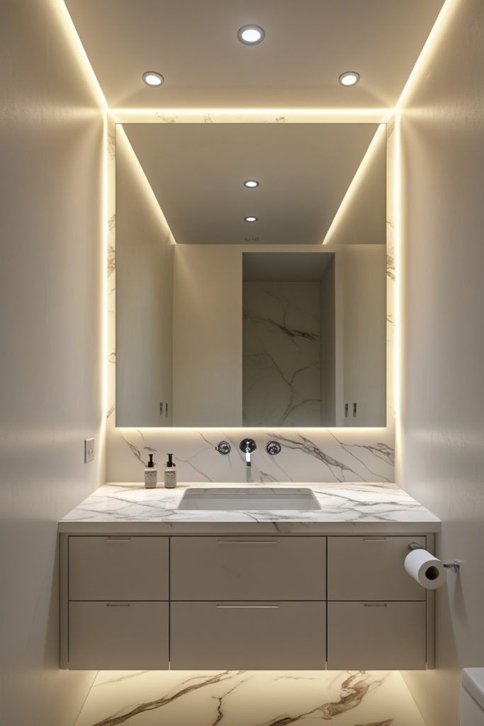 Mirrors are one of the most powerful tools in small bathroom design. A large, wall-to-wall mirror visually doubles space while reflecting natural and artificial light. Frameless mirrors or those with built-in LED lighting add a sleek, modern edge.
