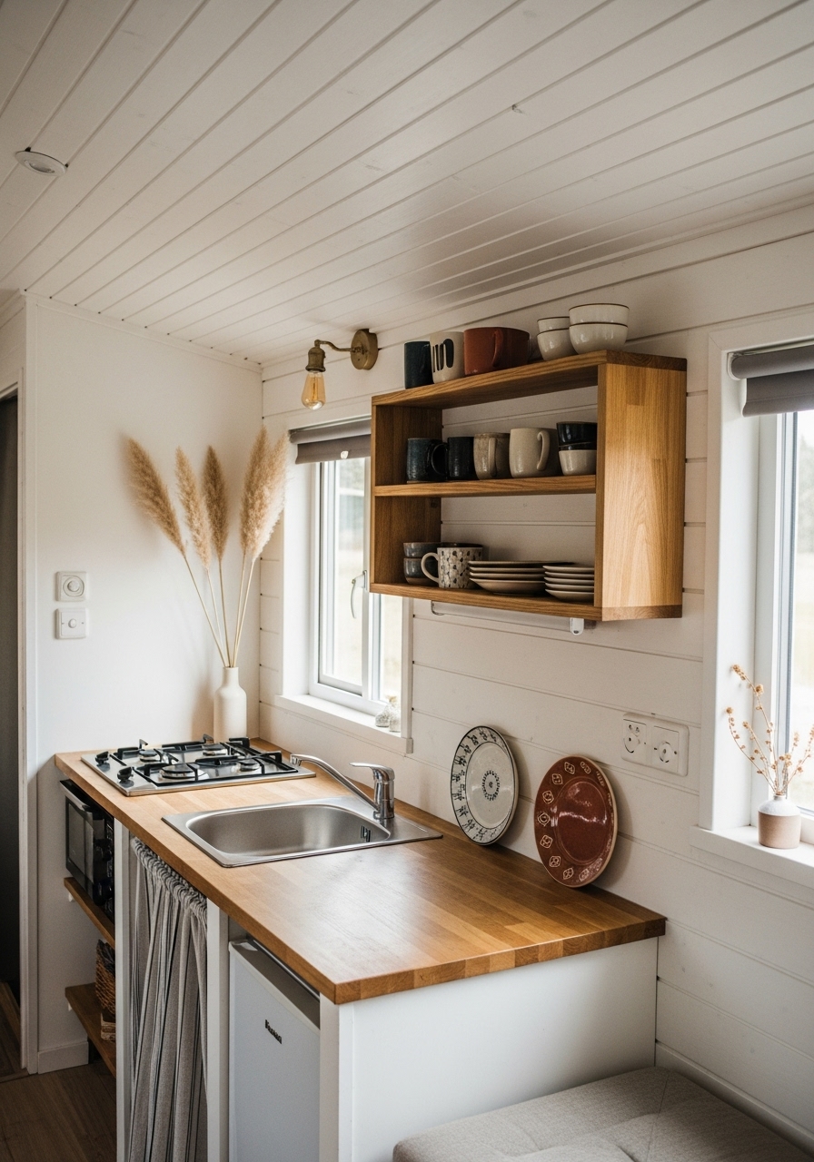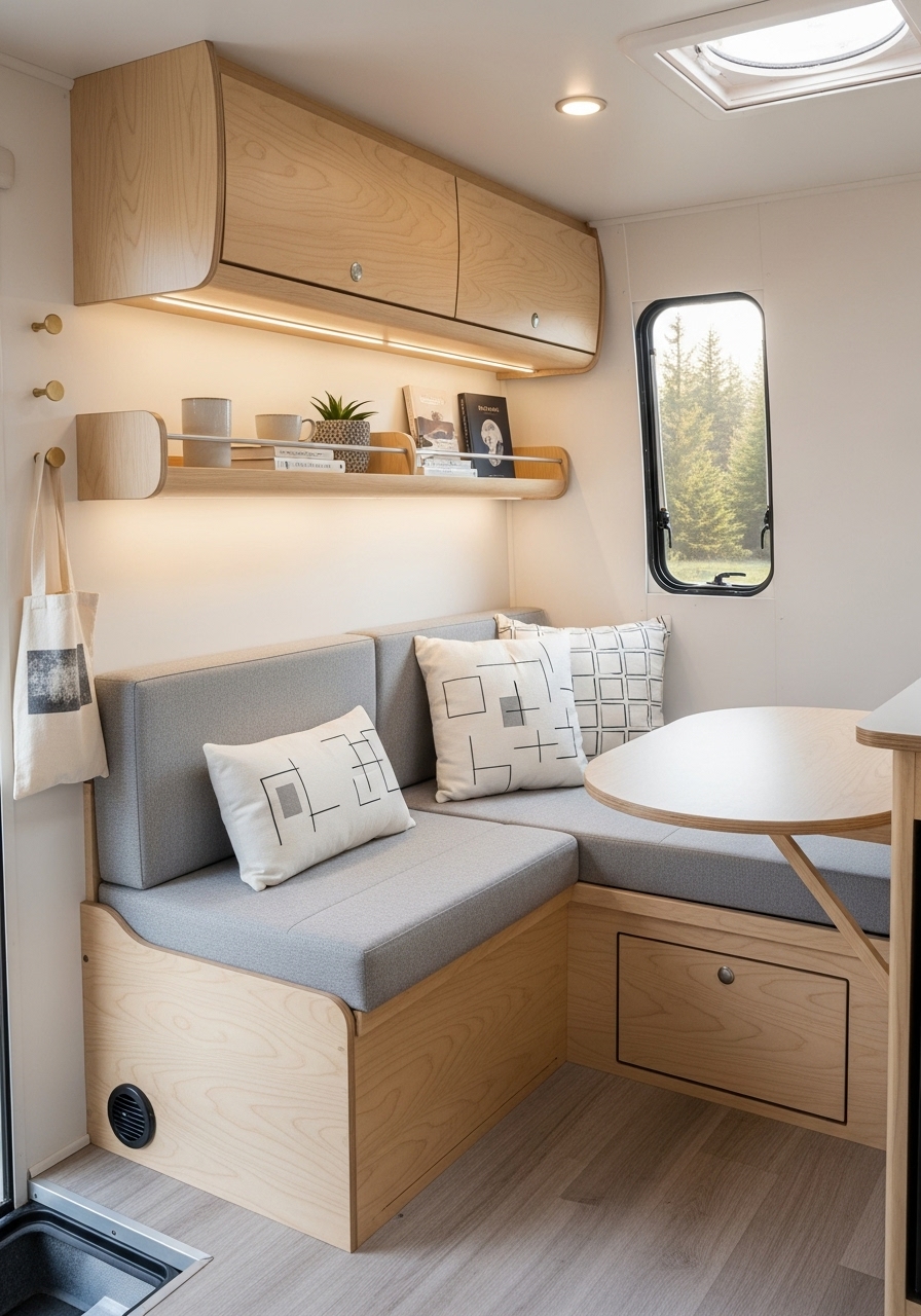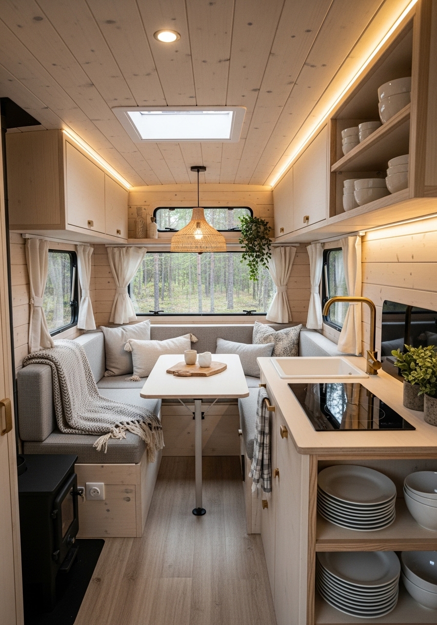 Storage in Scandinavian design is practical yet discreet. Think slim shelving, hidden compartments, or furniture with built-in drawers. Keeping items tucked away allows the space to remain serene, which is essential when living in a small camper. Decorative touches such as ceramic vases, minimalist wall art, or a single patterned rug can bring character while staying in line with the clean design philosophy.