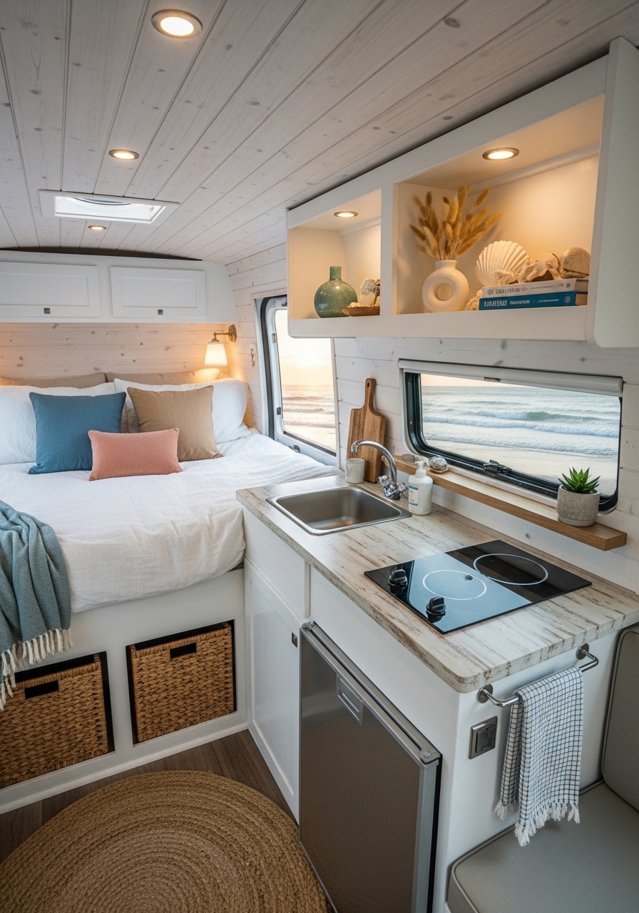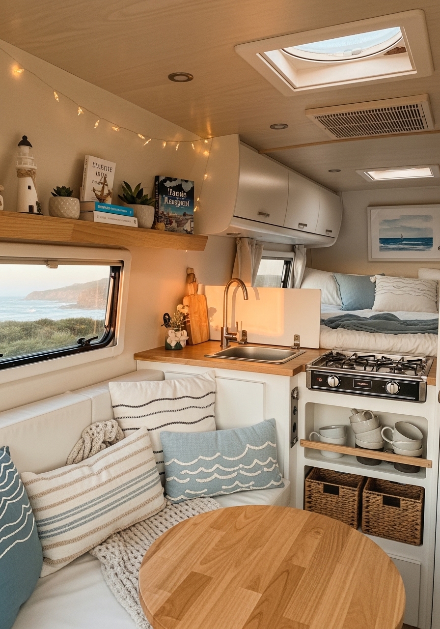 Coastal campers often focus on open, airy layouts that mimic the feeling of being by the water. Light curtains that let sunlight filter through, reflective mirrors, and open shelving create a sense of space. Keeping décor minimal but intentional helps maintain the breezy atmosphere.