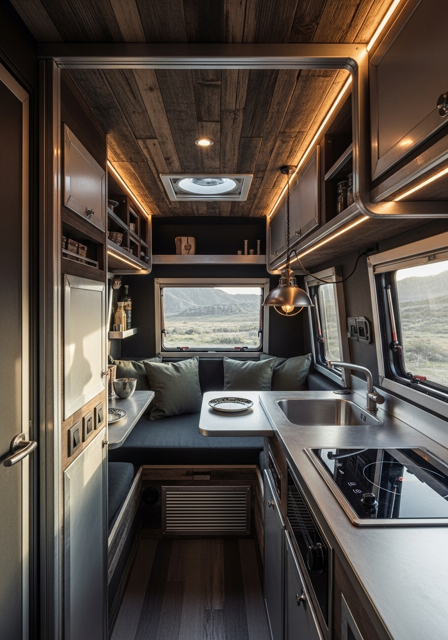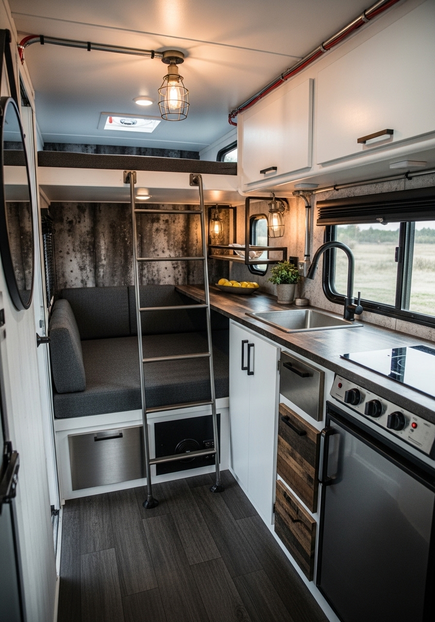 Lighting plays an essential role in industrial design. Edison bulbs, pendant lights, and cage fixtures create a moody yet inviting atmosphere. Pairing this lighting with darker tones can make a small camper feel intimate rather than cramped. For travelers who enjoy a modern, city-inspired aesthetic, this design brings sophistication and edge on the road.