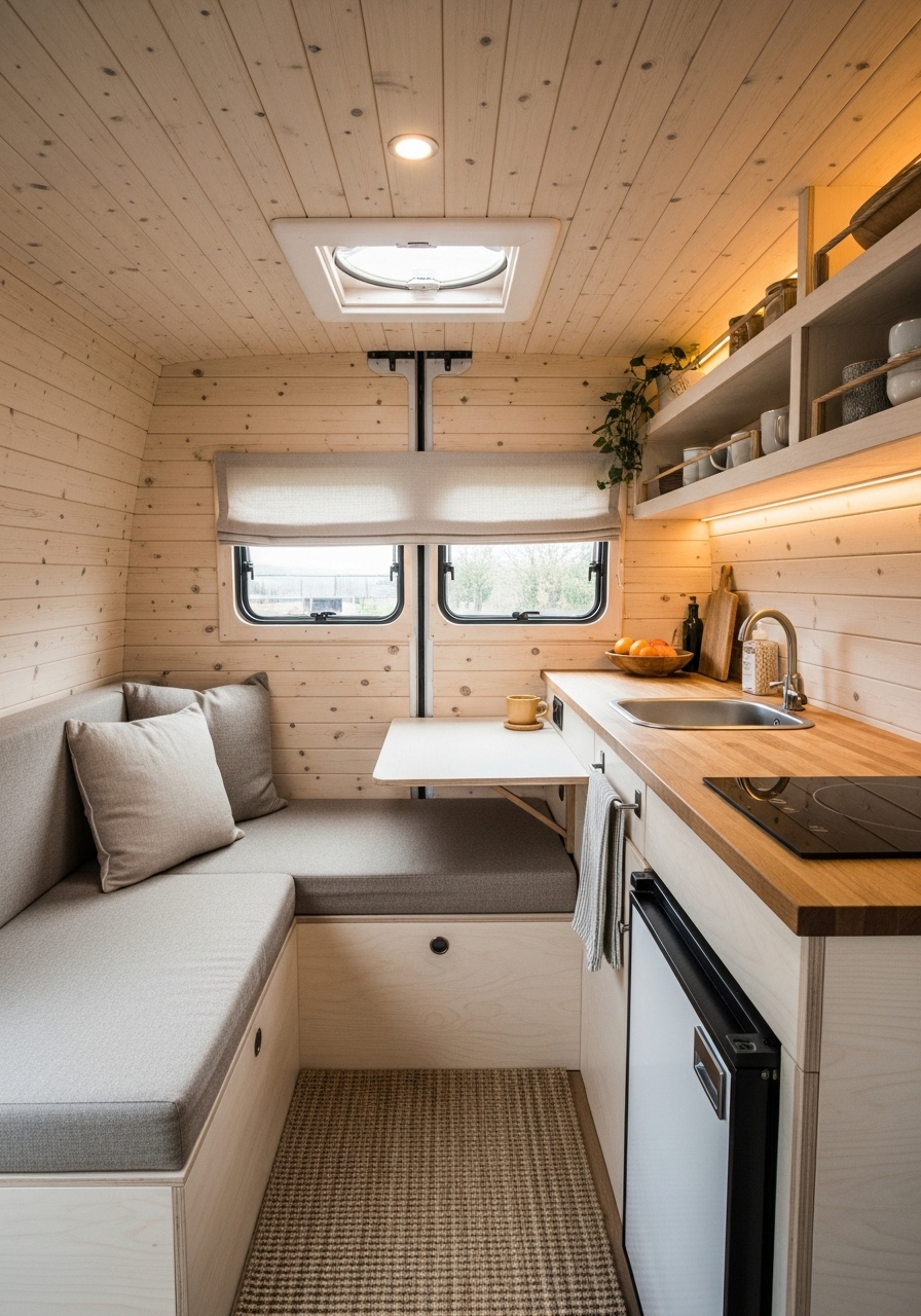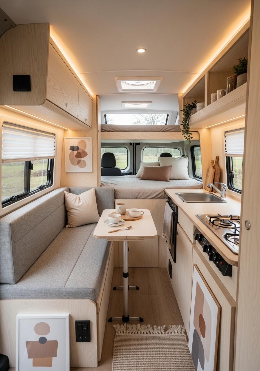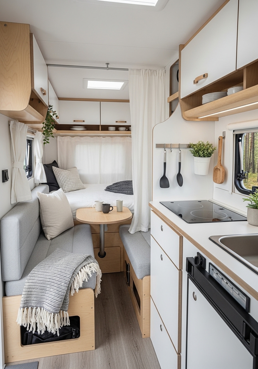 Scandinavian design has gained worldwide popularity for its balance of function, comfort, and beauty. In small campers, this design style feels particularly at home because of its focus on maximizing light, keeping things simple, and using natural materials. A Scandinavian-inspired camper is calm, organized, and visually harmonious.