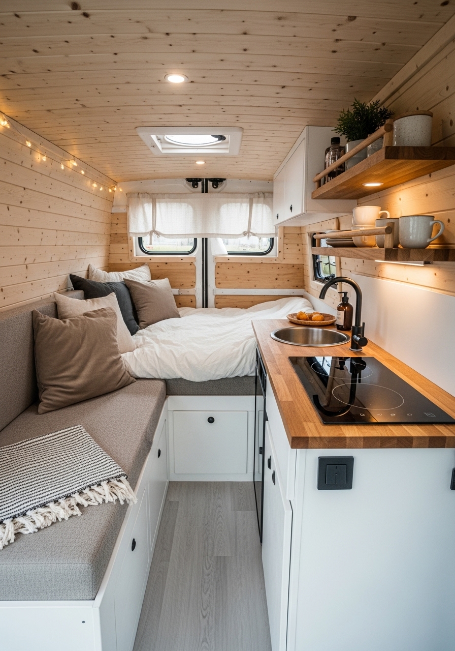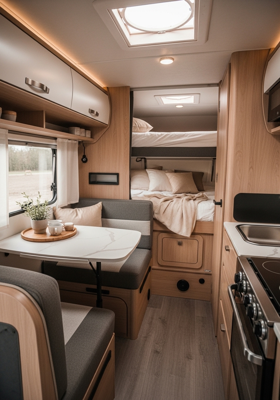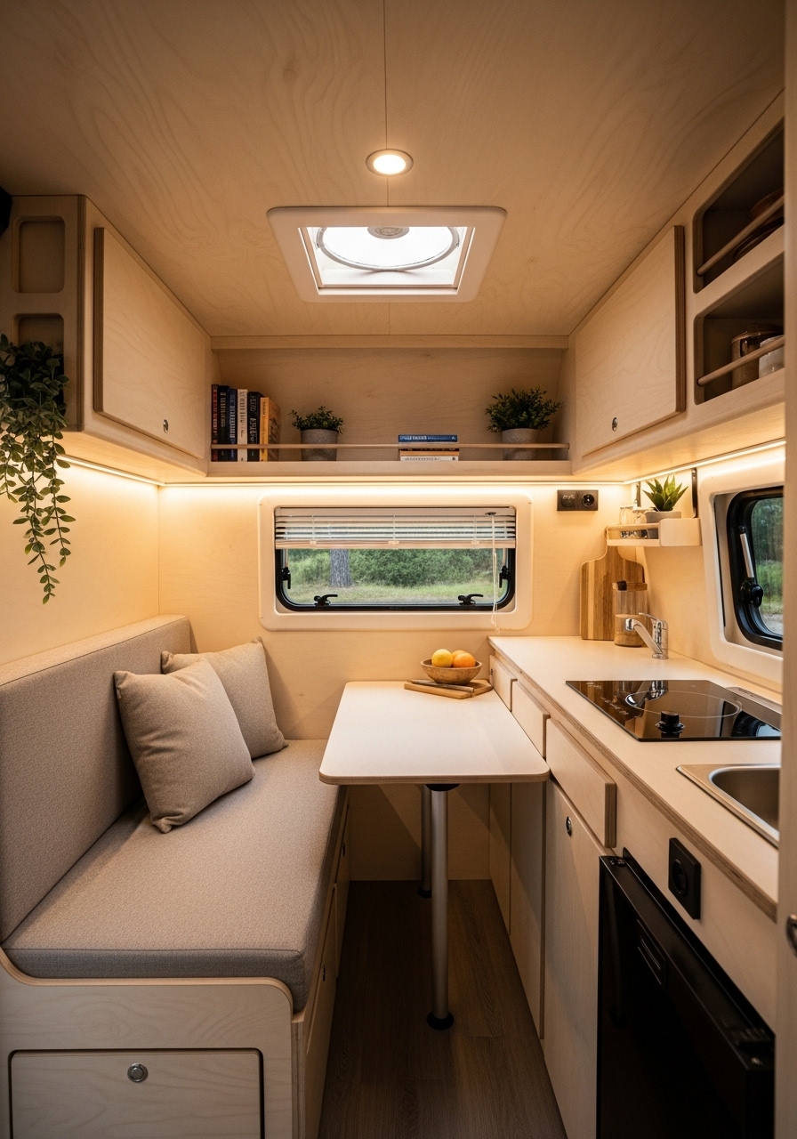 Scandinavian design has gained worldwide popularity for its balance of function, comfort, and beauty. In small campers, this design style feels particularly at home because of its focus on maximizing light, keeping things simple, and using natural materials. A Scandinavian-inspired camper is calm, organized, and visually harmonious.