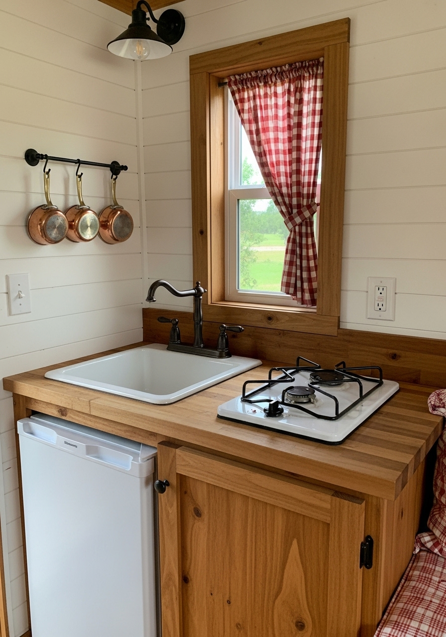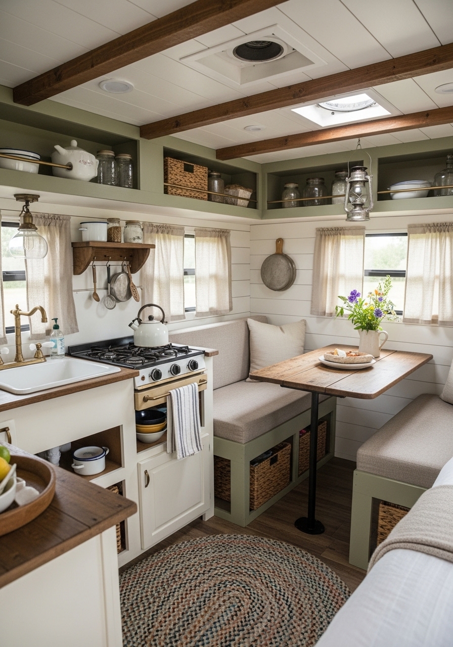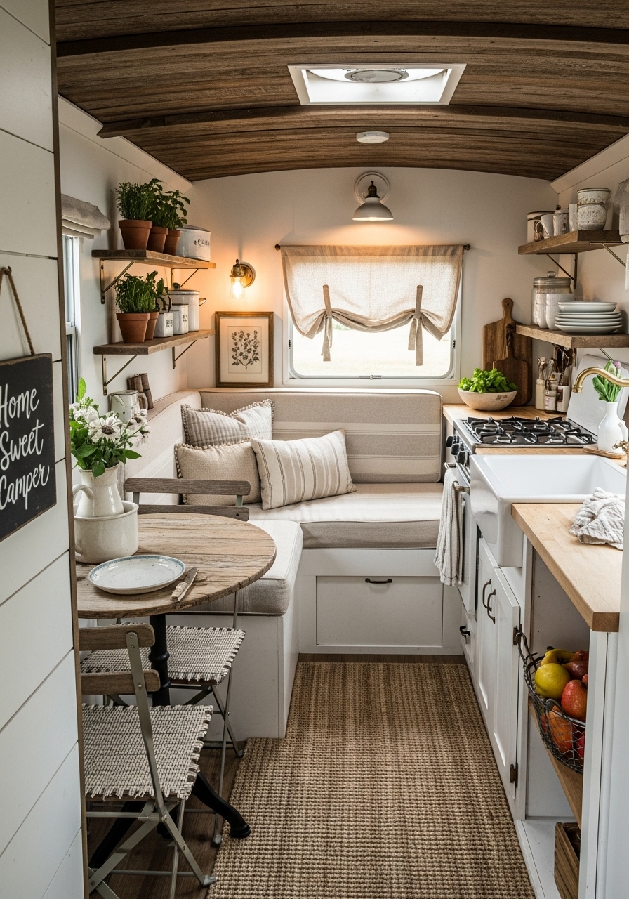 One of the easiest ways to bring farmhouse charm into a camper is through wood accents. Exposed beams, faux shiplap, or even peel-and-stick wood wallpaper can instantly change the feel of a space. Pairing these with distressed finishes, iron fixtures, and soft neutral upholstery creates a lived-in yet stylish look. Even in small spaces, the right textures can give the impression of depth and warmth.
