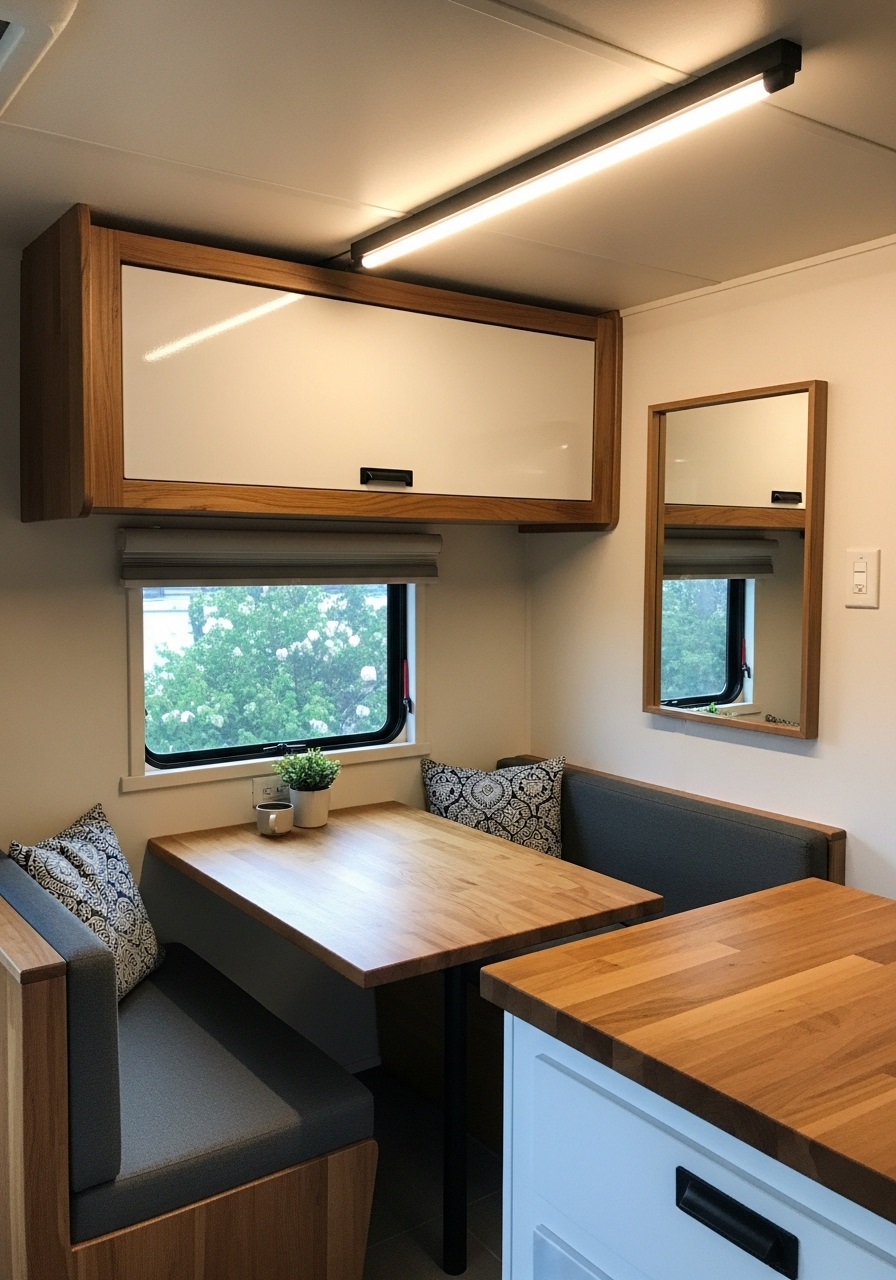 Lighting also plays a significant role. Recessed LED lights, slim wall sconces, or even simple battery-powered lamps provide a soft glow without taking up valuable room. By layering natural daylight with strategically placed artificial lights, a small camper can feel bright, open, and welcoming.