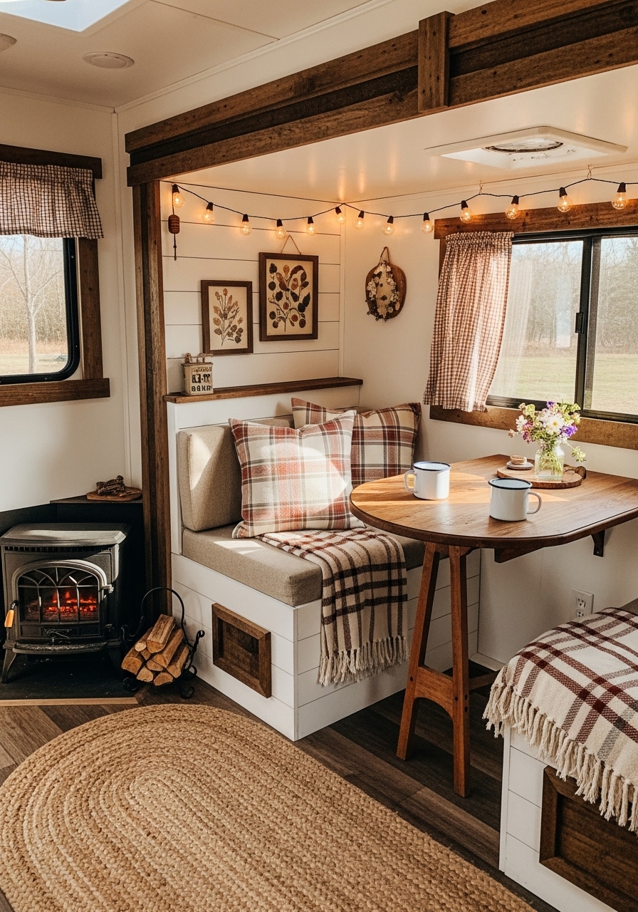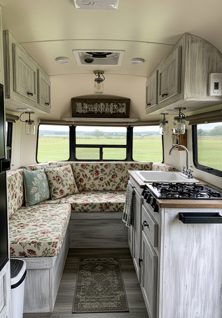Rustic farmhouse design also allows for creative repurposing. For example, vintage crates can become storage bins, and enamel mugs can double as both décor and kitchen essentials. These multipurpose details not only save space but also give your camper character. Adding plaid or floral textiles in muted tones brings comfort while staying true to farmhouse tradition.