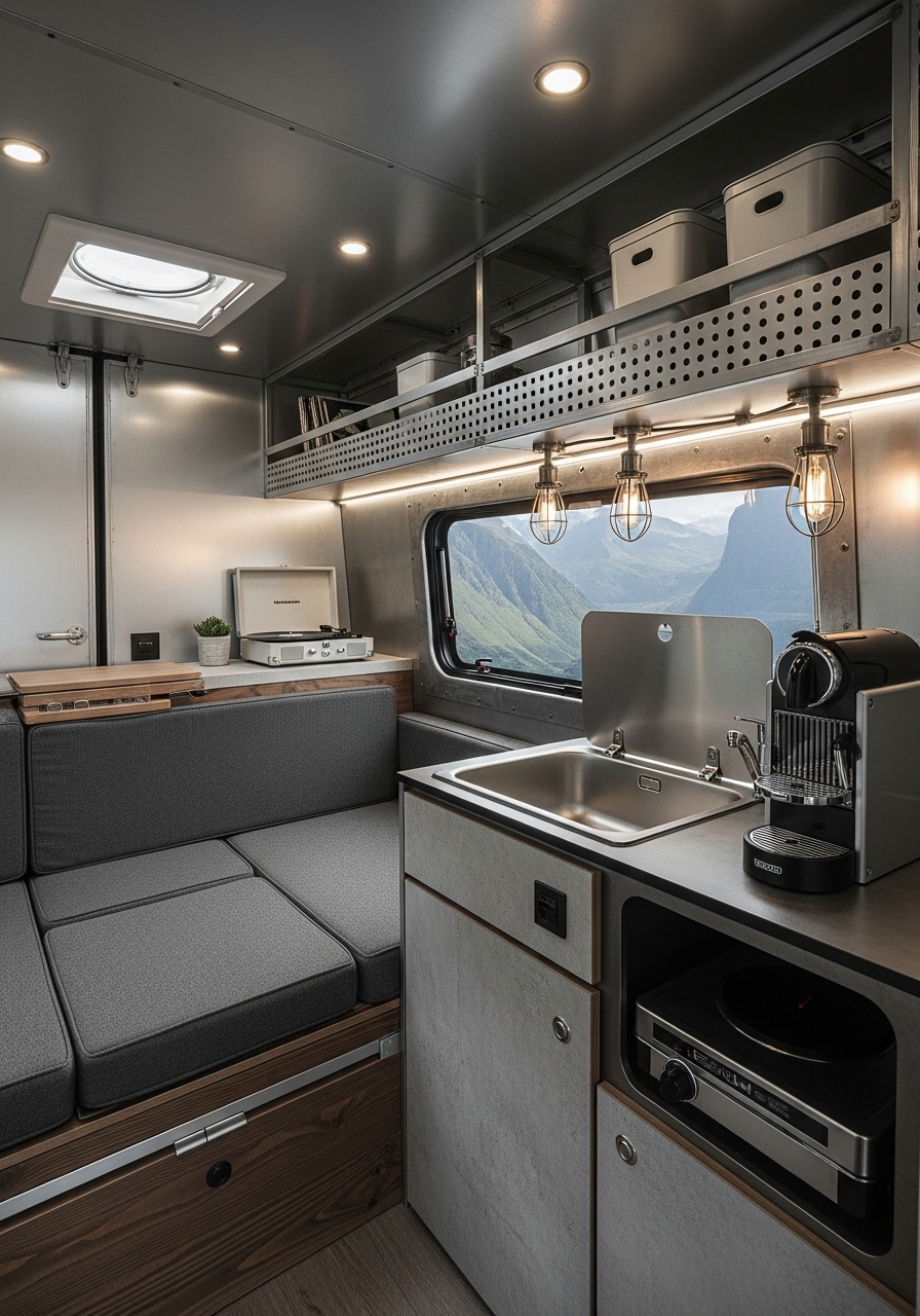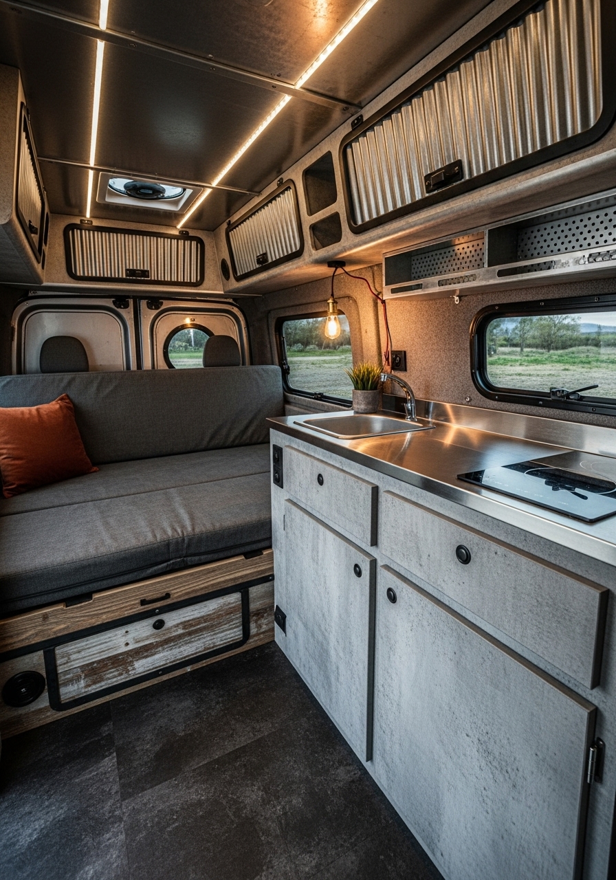 Industrial campers rely heavily on functional furniture. Think of streamlined metal chairs, collapsible tables, and built-in units with strong, clean lines. This approach ensures durability while still looking stylish. Adding soft textures like leather cushions or faux fur throws helps balance the hardness of metal and concrete finishes.