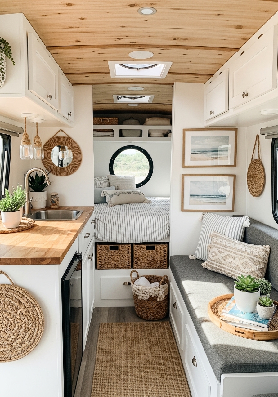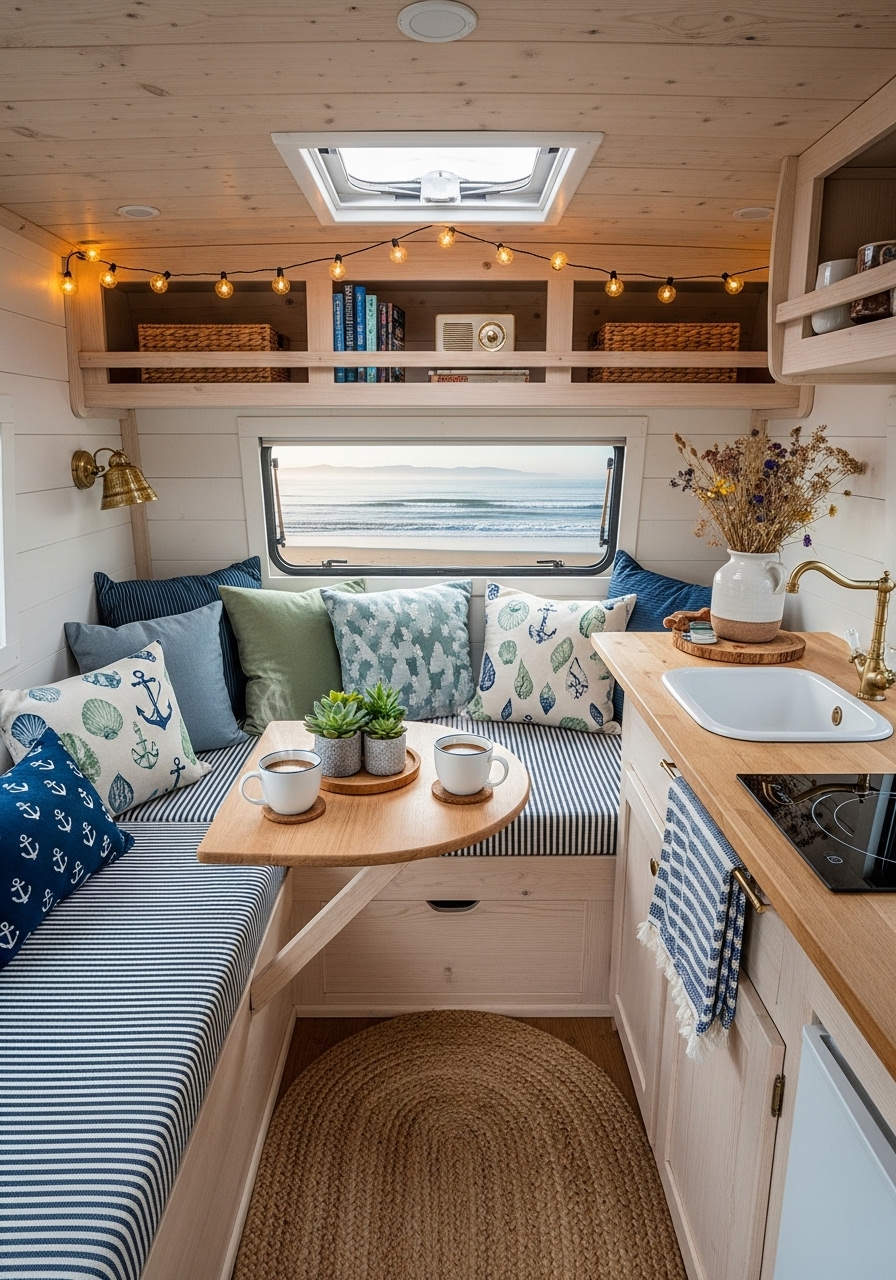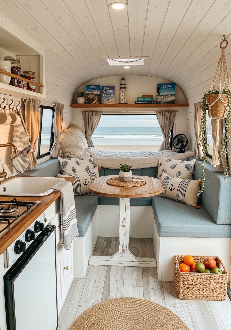 For travelers who dream of sandy shores and ocean breezes, a coastal-inspired camper interior can bring the beach with you wherever you go. This style captures the relaxed, airy feeling of coastal living with light colors, natural textures, and nautical touches. In a small camper, it creates a refreshing and tranquil escape.