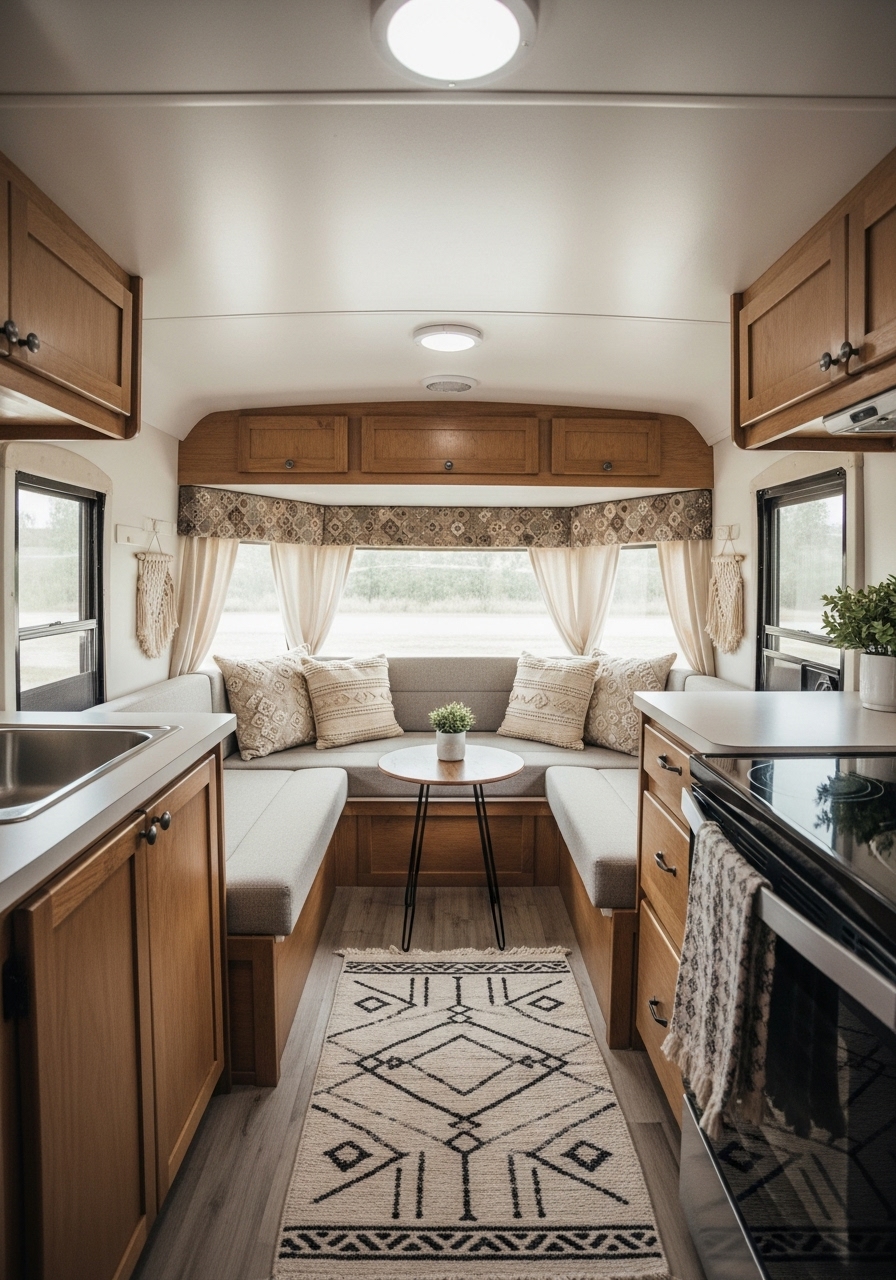 If you prefer a camper full of personality and color, a modern boho design could be your perfect fit. This style embraces eclectic patterns, vibrant textiles, and layered textures to create a space that feels free-spirited and relaxed. In a small camper, this style can add life and energy without overwhelming the space when done thoughtfully.