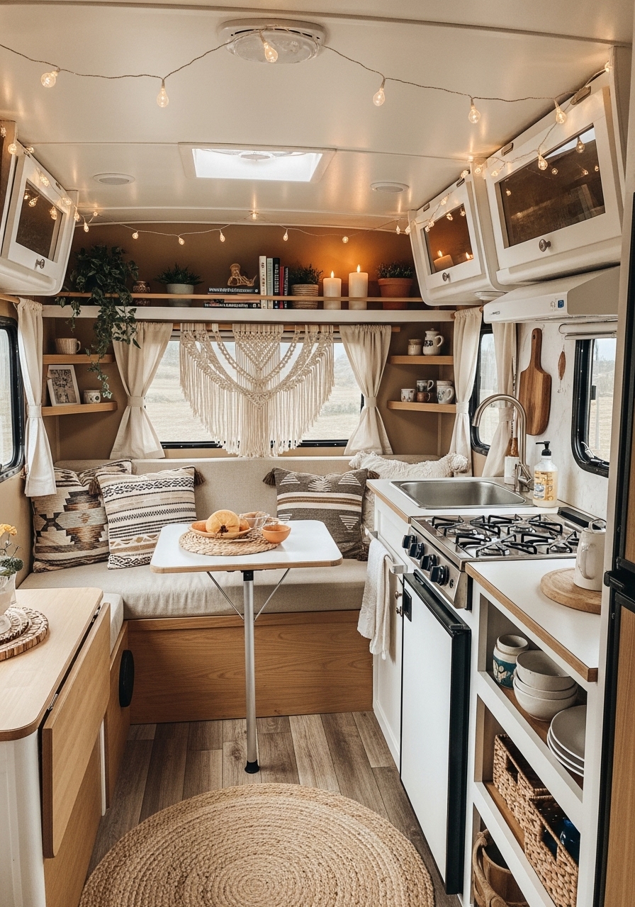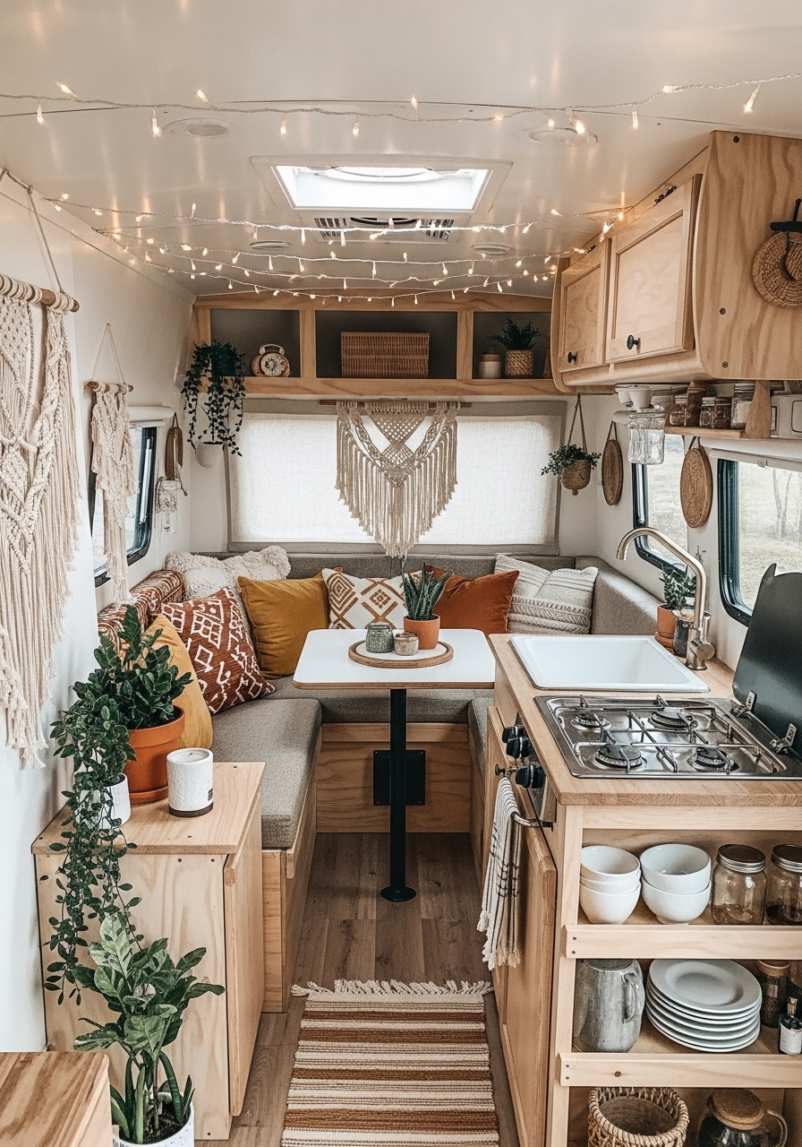 Lighting in a boho camper tends to be warm and whimsical. String lights, lanterns, and natural rattan lampshades can create a magical glow in the evenings, enhancing the atmosphere. This style is especially popular for travelers who want their camper to feel like both a cozy home and an adventurous sanctuary.