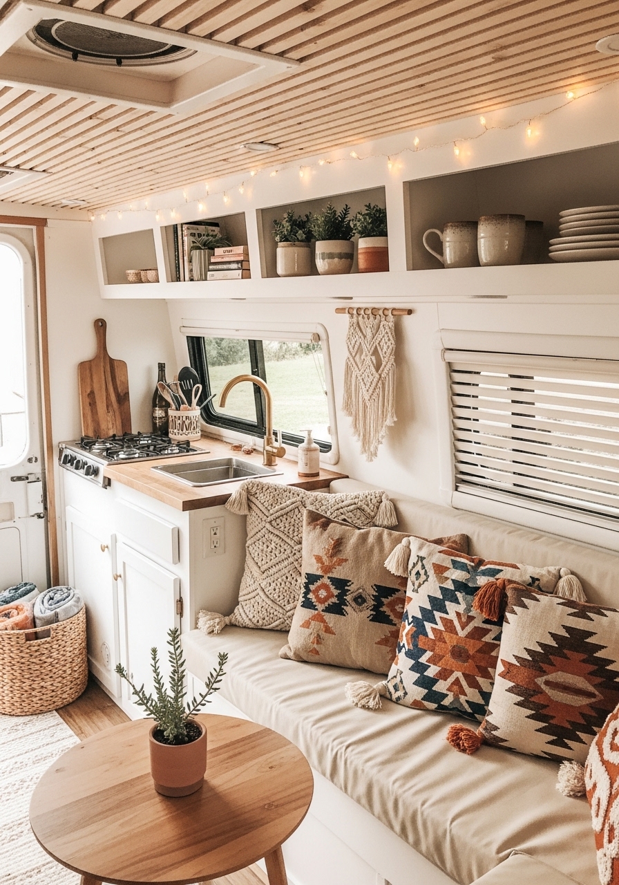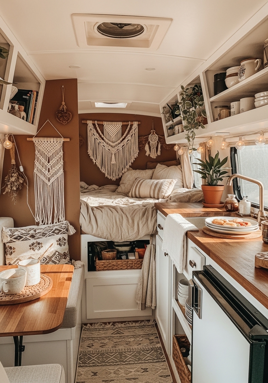 Since space is limited, focus on a few statement pieces instead of filling every corner. A bold rug or a patterned bedding set can anchor the look while leaving room for practical necessities. Plants also play a huge role in boho campers. Hanging planters, trailing vines, or small succulents bring in nature and soften the look of compact interiors.