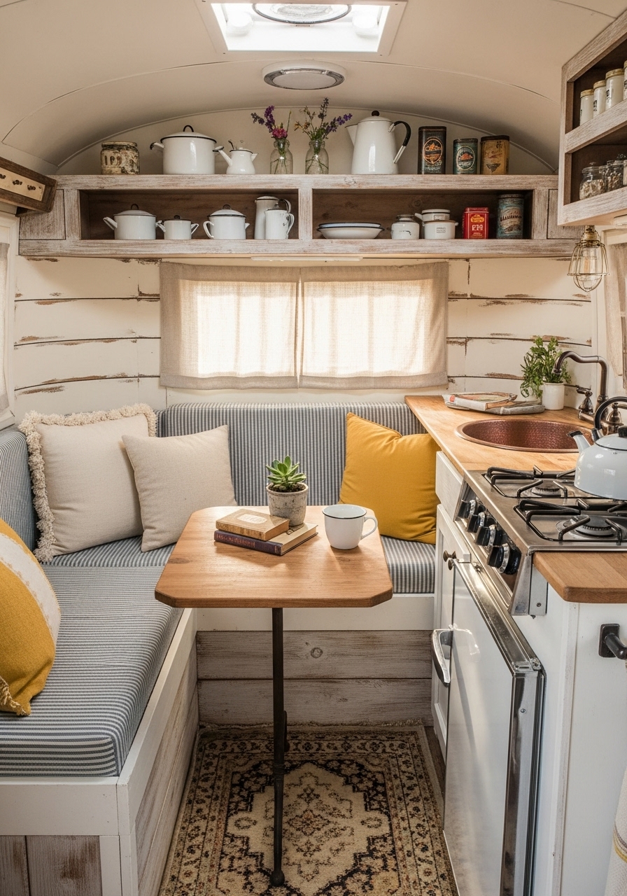 For those who love warmth and character, a rustic farmhouse look can make a small camper feel like a country cabin on wheels. This design style blends natural textures, warm colors, and vintage-inspired accents that create a cozy and inviting space. Imagine soft linen curtains, reclaimed wood paneling, and open shelving with mason jars filled with essentials — every detail adds to the farmhouse atmosphere.