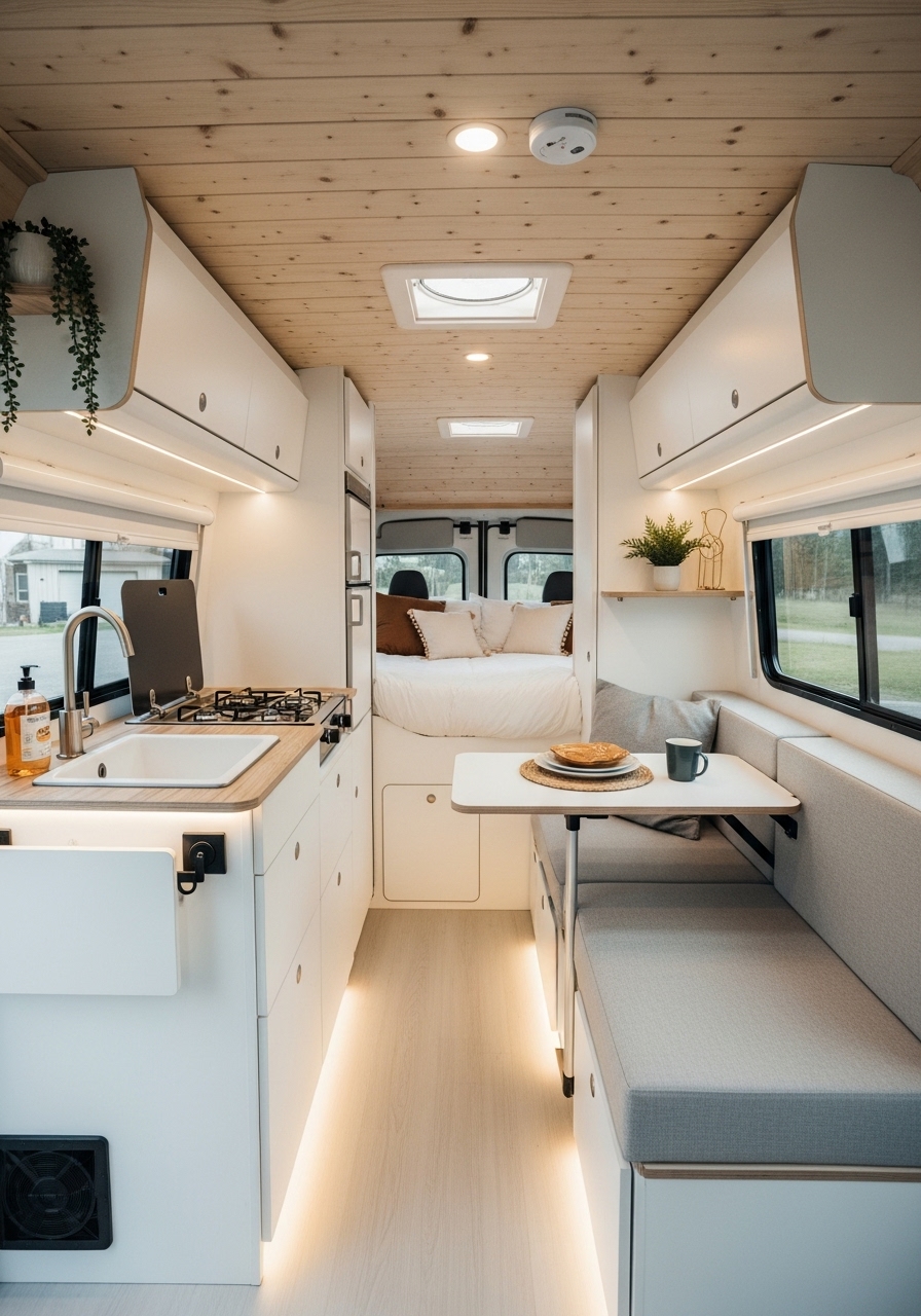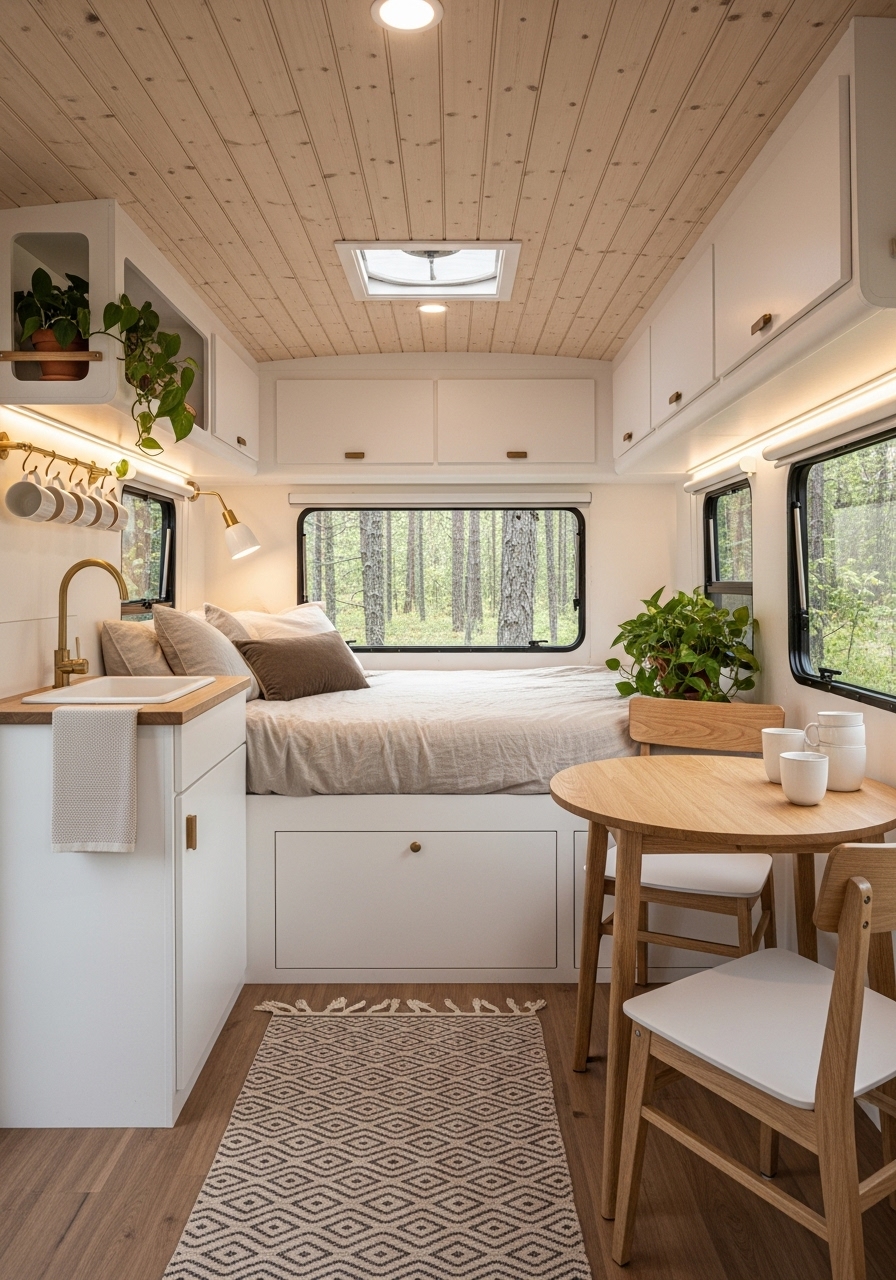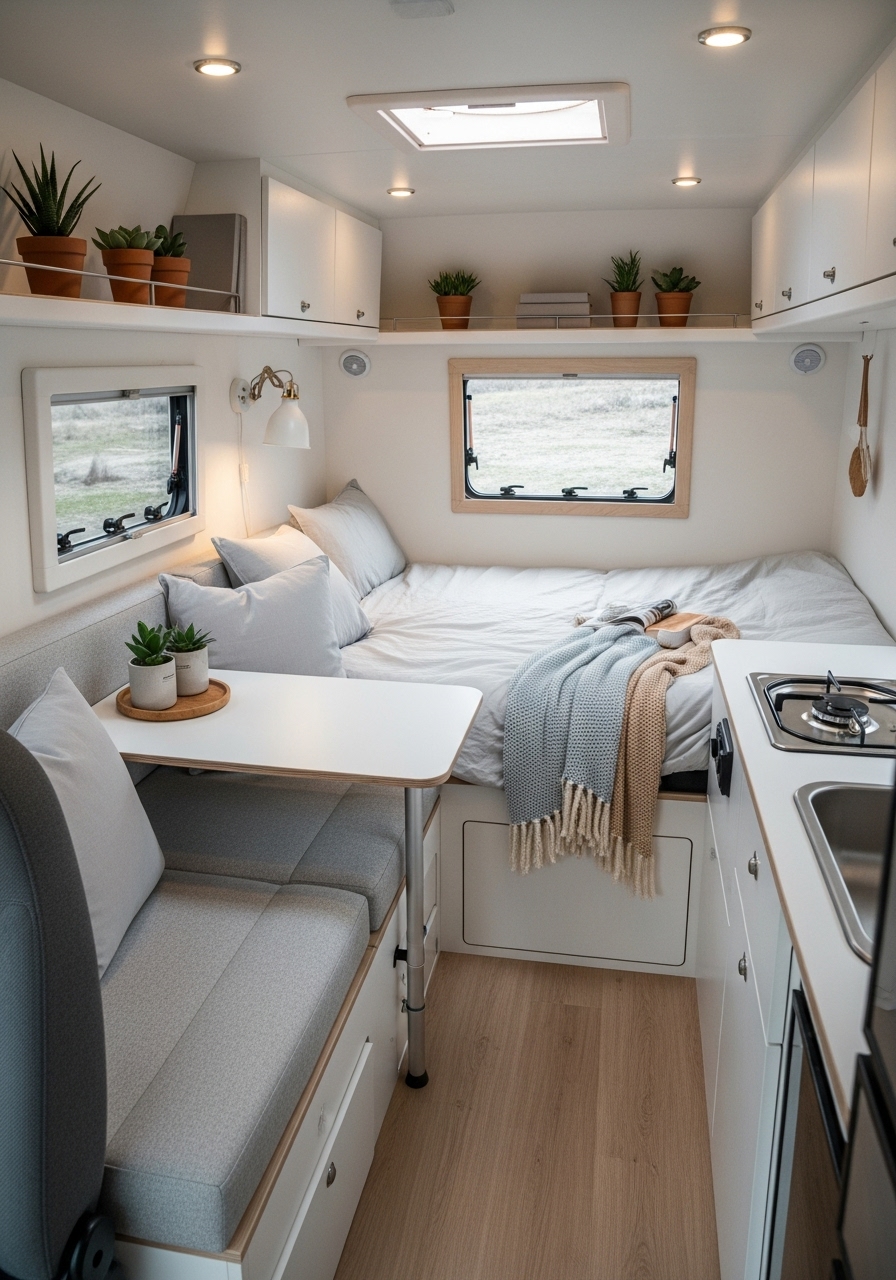 Minimalist décor does not mean boring. Adding a few textured throw blankets, neutral-toned rugs, or small potted plants can add warmth while keeping with the simple style. This design direction works especially well for travelers who enjoy a serene, hotel-like feel in their camper.