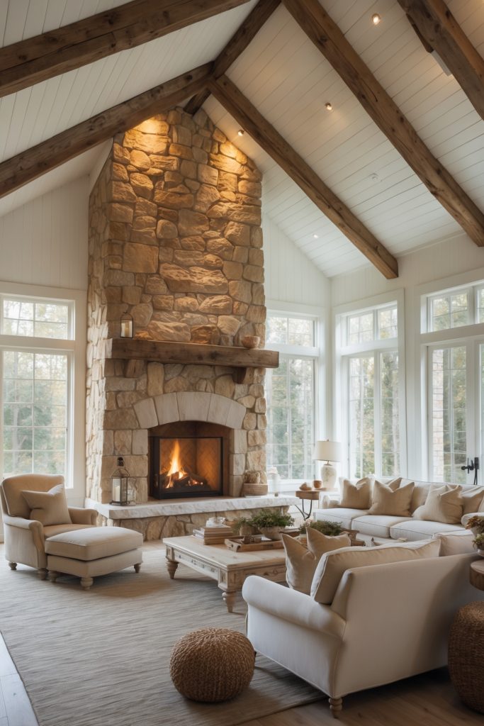 Enhance the design with floating wooden shelves on either side for additional storage and display. Combining shiplap with stone or brick accents can further emphasize the rustic farmhouse vibe. This design not only boosts aesthetic appeal but also increases the functional use of the space around the hearth.