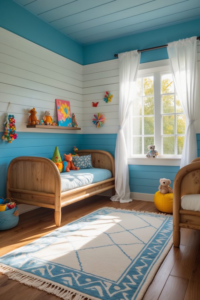 Break away from the usual solid color scheme and try a two-tone approach by painting the upper and lower sections of your shiplap in different shades. This works well with Half Wall Paneling Ideas in kids’ rooms or eclectic spaces.