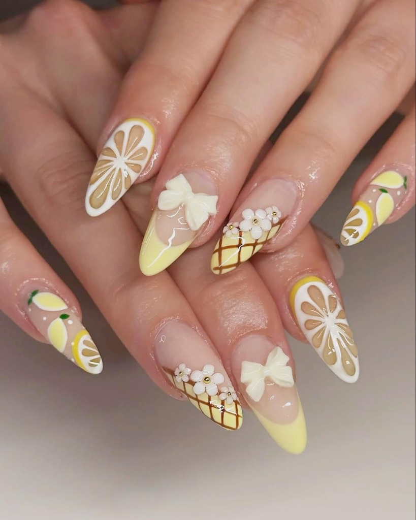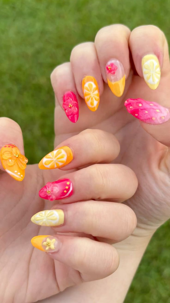 Focus on the cross-section of the fruit for a zesty, energetic vibe. Paint the white “pith” and the triangular segments of a lemon on the tips of your nails. Adding a few clear “dew drops” using a 3D builder gel can make the fruit look incredibly realistic and juicy.