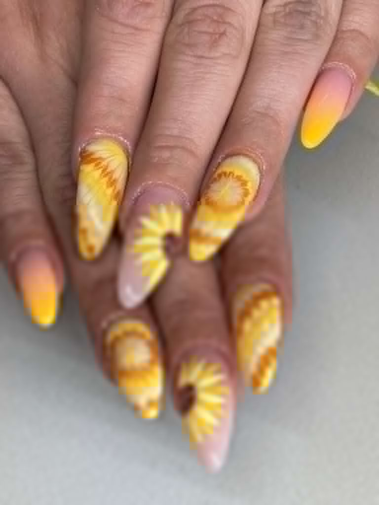 Sunflowers are the undisputed kings of the season, and they look stunning as nail art. Use a warm mustard yellow for the petals and a textured dark brown for the centers. Placing these large-scale florals across two adjacent nails creates a “mural” effect that feels intentional and high-end.