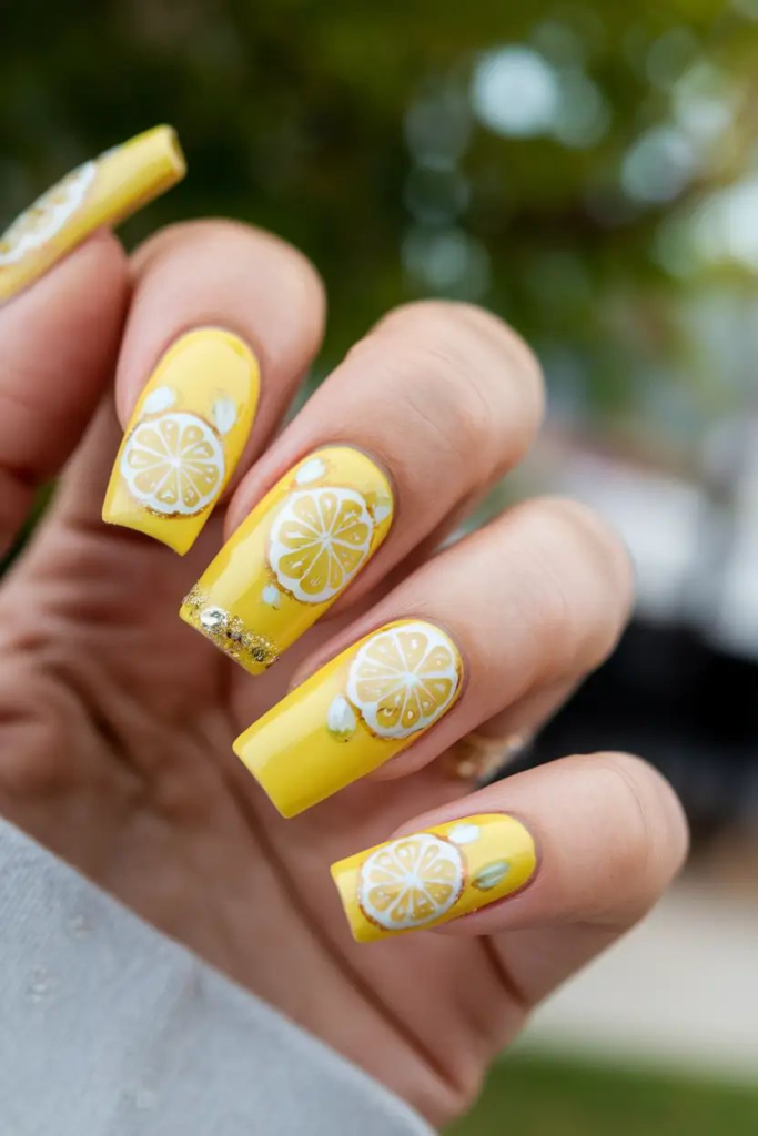 Bring a touch of the Italian countryside to your manicure with hand-painted lemon branches. Use a crisp white base and add tiny, detailed yellow lemons with delicate green leaves on one or two accent nails. The remaining fingers can stay a solid, creamy matte yellow to keep the look grounded.