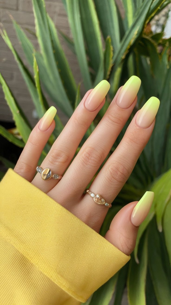 Using an airbrush technique (or a clever sponge application), create a “glow” effect where a bright neon yellow fades out from the center of a neutral-colored nail. This “aura” style is a major trend in modern nail art and looks almost holographic.